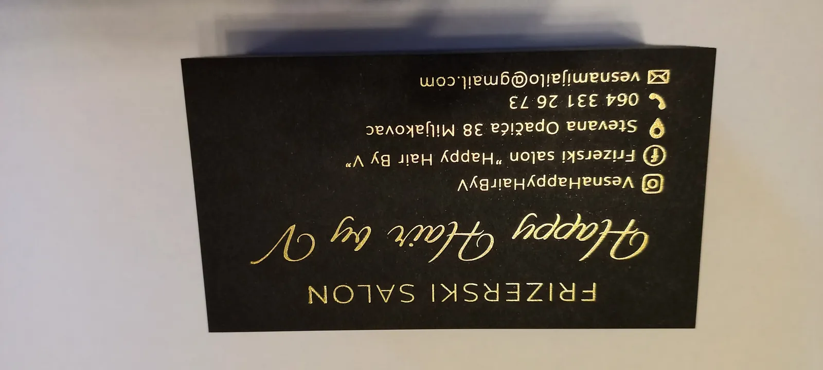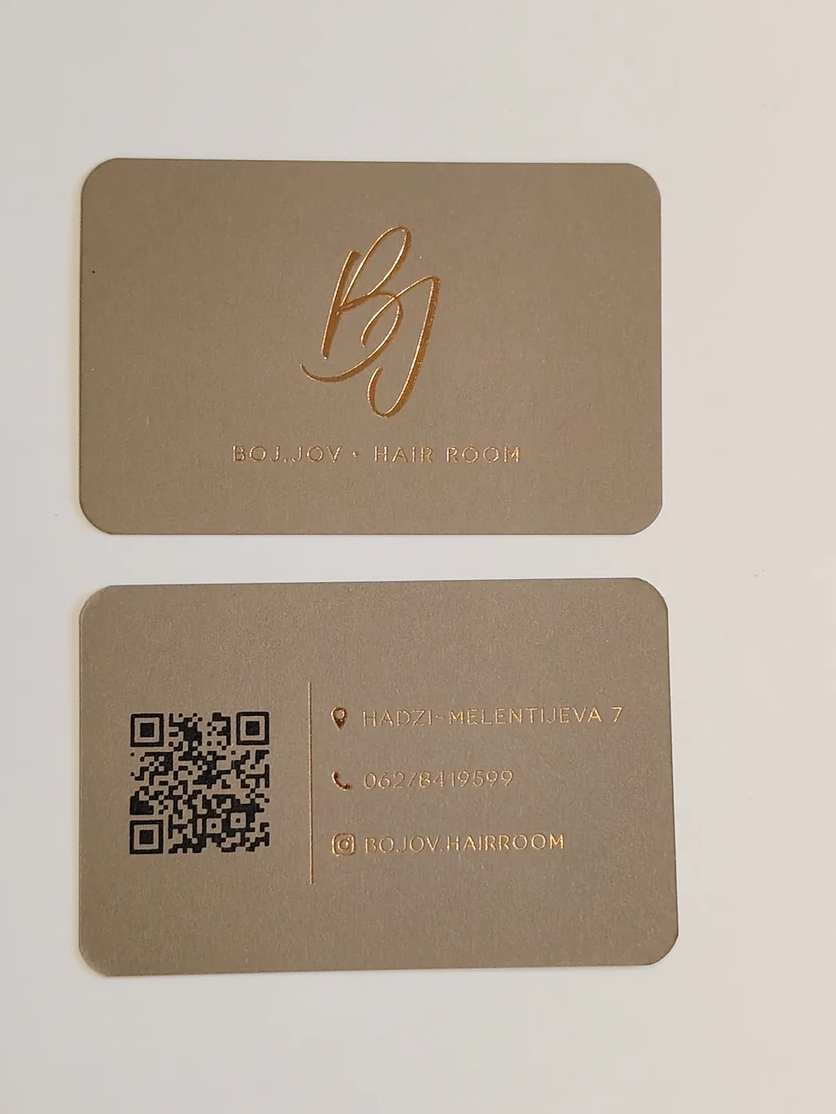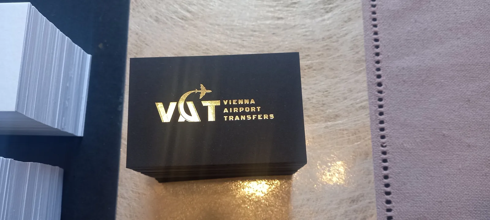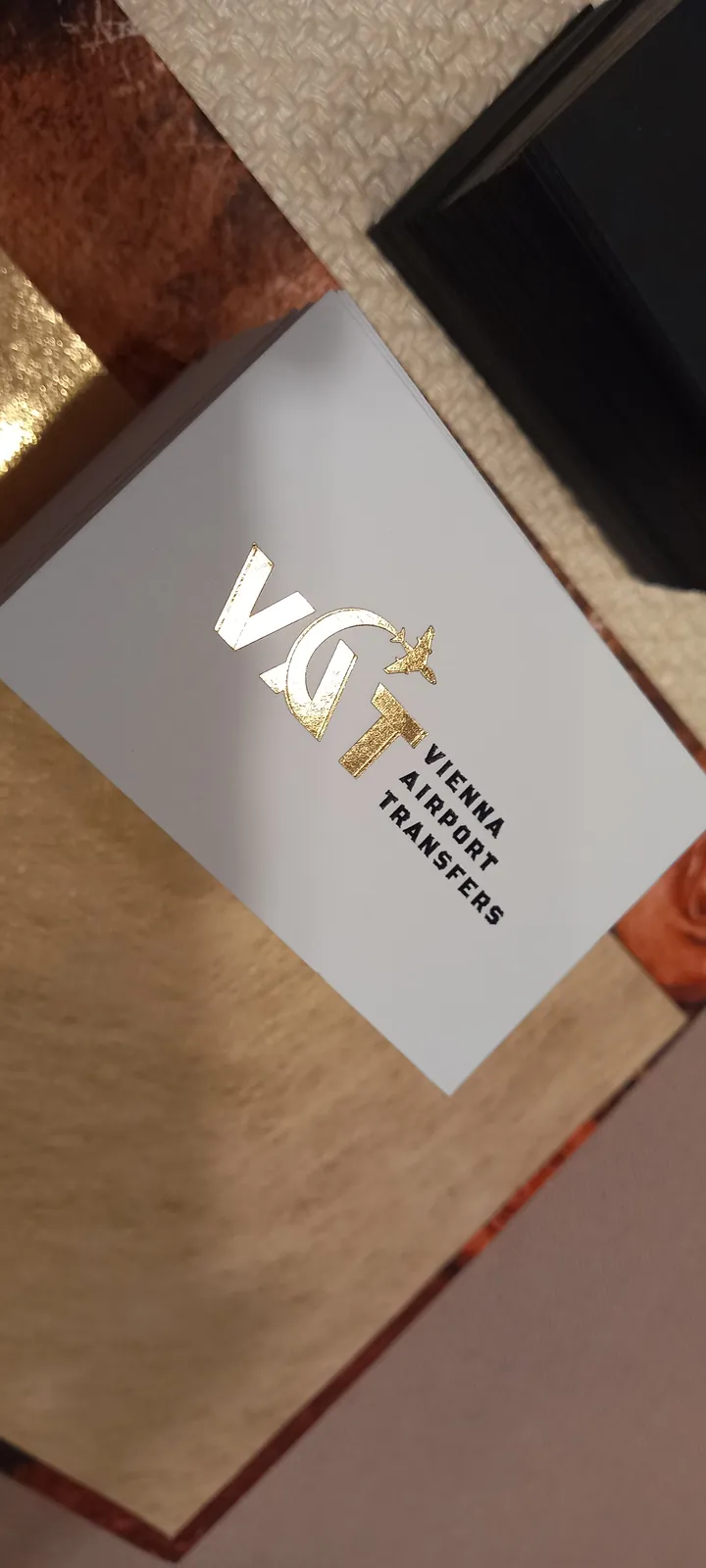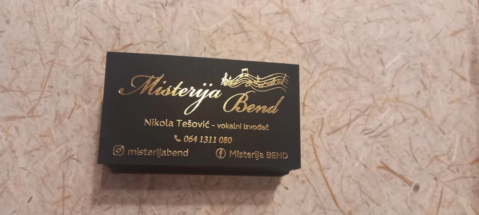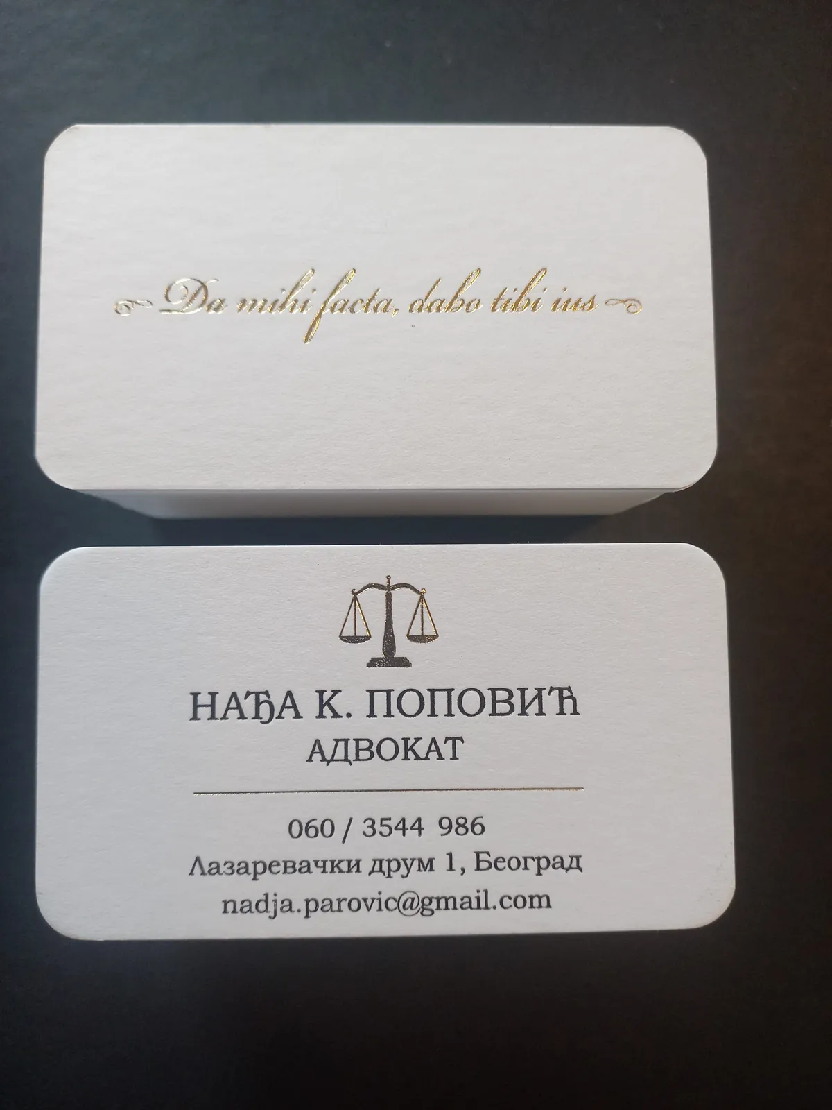 Za vizit karte sa zlatotiskom postali smo pravi stručnjaci, jer godinama najviše radimo baš ovakve vizit karte. Za ove otmene i luksuzne vizit karte u zlatotisku, obavezno se koriste italijanski papiri, boje po želji: bela, bež, crna u zadnje vreme najpopularnija, zelena, ljubičasta, bordo, teget...Grafičku pripremu vam možemo uraditi mi. Ukoliko želite vizit karte u zlatotisku, neophodna je priprema u vektorskom formatu, jer se po njoj prave klišei, a slova se otiskuju u zlatnoj foliji pod viskom temperaturom. Slova imaju izuzetan sjaj. Što se tiče čvrstine papira, u ovoj varijanti je moguće uraditi štampu i na dosta čvršćem papiru do 450 grama jer ova vrsta štampe to dozvoljava. Kao završnu obradu, predlažemo zaobljene ivice, to je stvar izbora, nekome se sviđa, nekome ne. Ceo tekst može se štampati samo na prednjoj strani, što je povoljnije. Naravno, može biti i obostrani zlatotisak.
