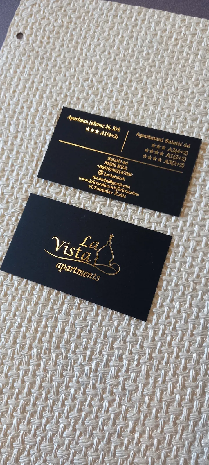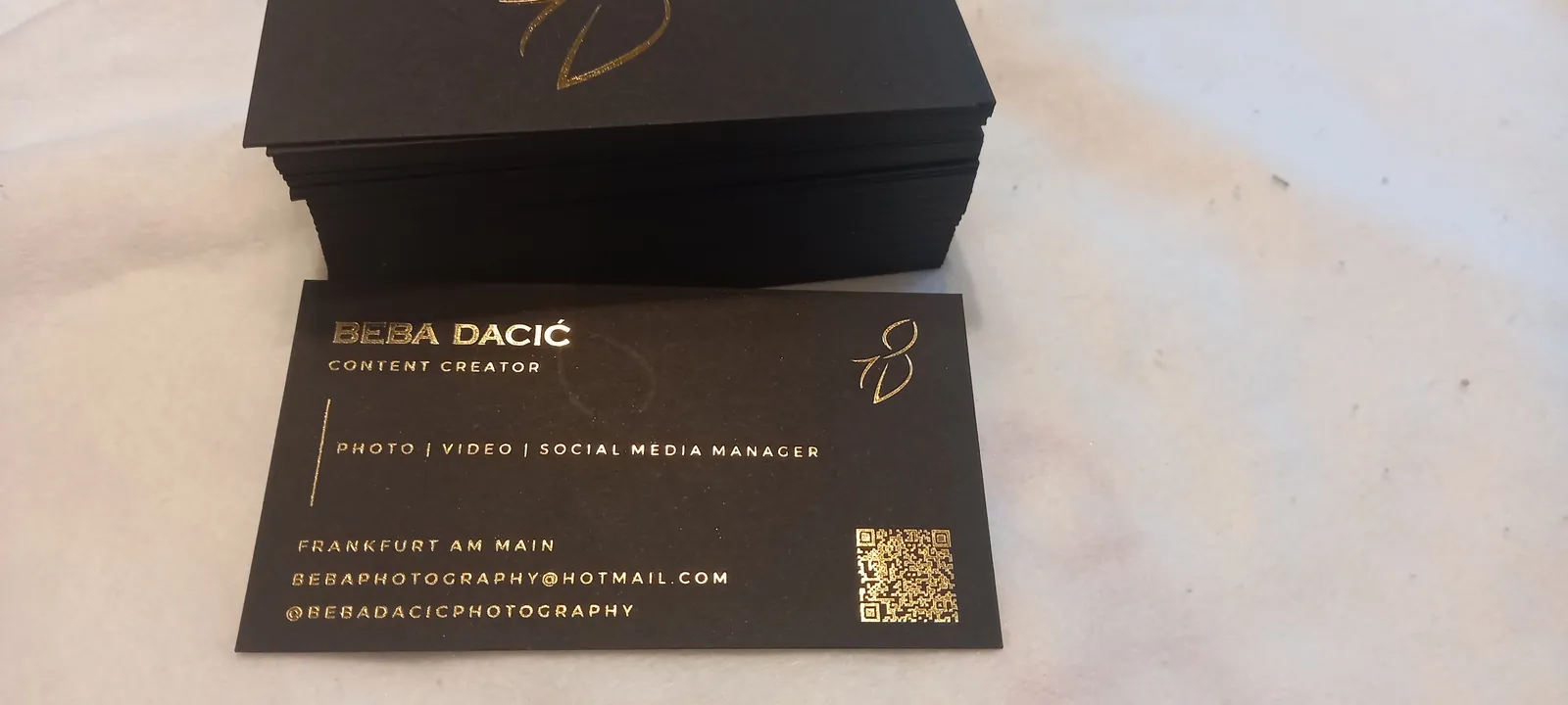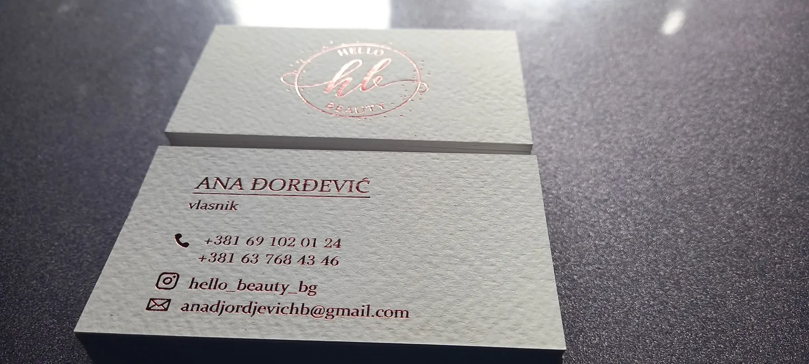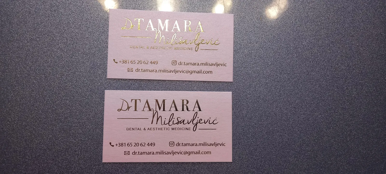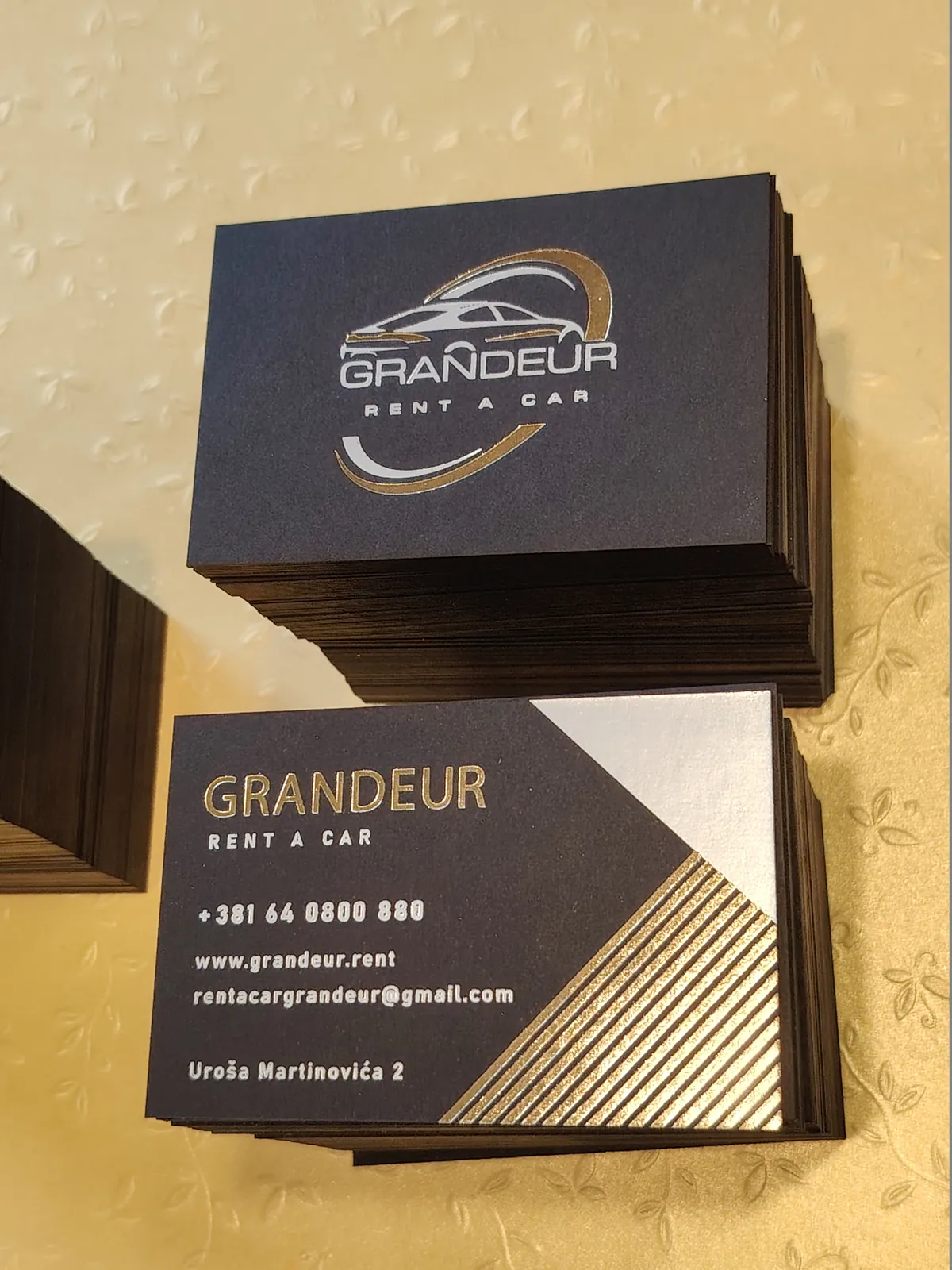 Za vizit karte sa zlatotiskom postali smo pravi stručnjaci, jer godinama najviše radimo baš ovakve vizit karte. Za ove otmene i luksuzne vizit karte u zlatotisku, obavezno se koriste italijanski papiri, boje po želji: bela, bež, crna u zadnje vreme najpopularnija, zelena, ljubičasta, bordo, teget...Grafičku pripremu vam možemo uraditi mi. Ukoliko želite vizit karte u zlatotisku, neophodna je priprema u vektorskom formatu, jer se po njoj prave klišei, a slova se otiskuju u zlatnoj foliji pod viskom temperaturom. Slova imaju izuzetan sjaj. Što se tiče čvrstine papira, u ovoj varijanti je moguće uraditi štampu i na dosta čvršćem papiru do 450 grama jer ova vrsta štampe to dozvoljava. Kao završnu obradu, predlažemo zaobljene ivice, to je stvar izbora, nekome se sviđa, nekome ne. Ceo tekst može se štampati samo na prednjoj strani, što je povoljnije. Naravno, može biti i obostrani zlatotisak.