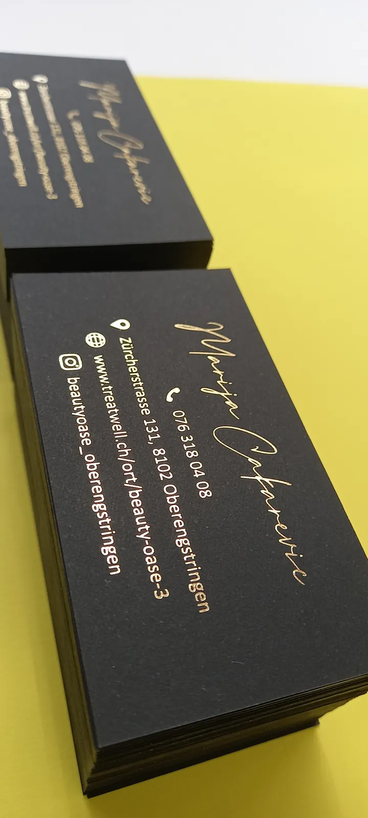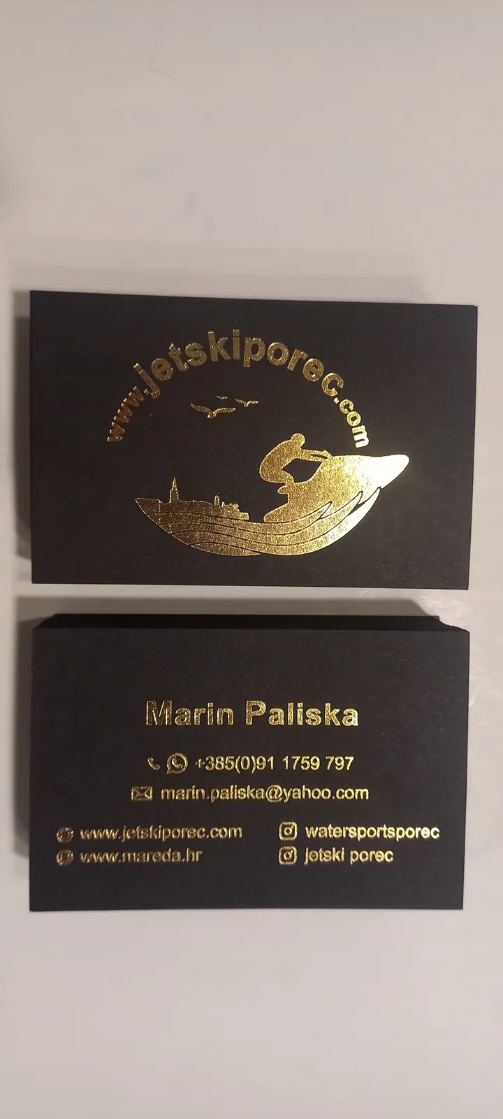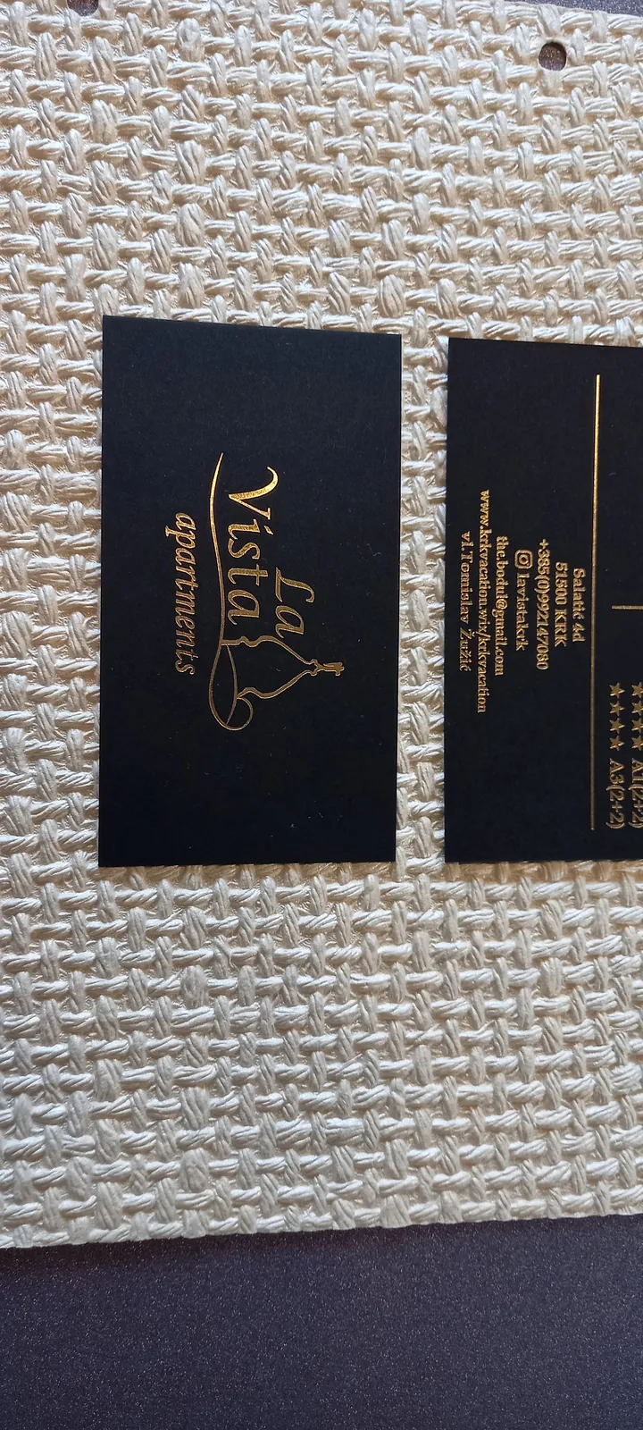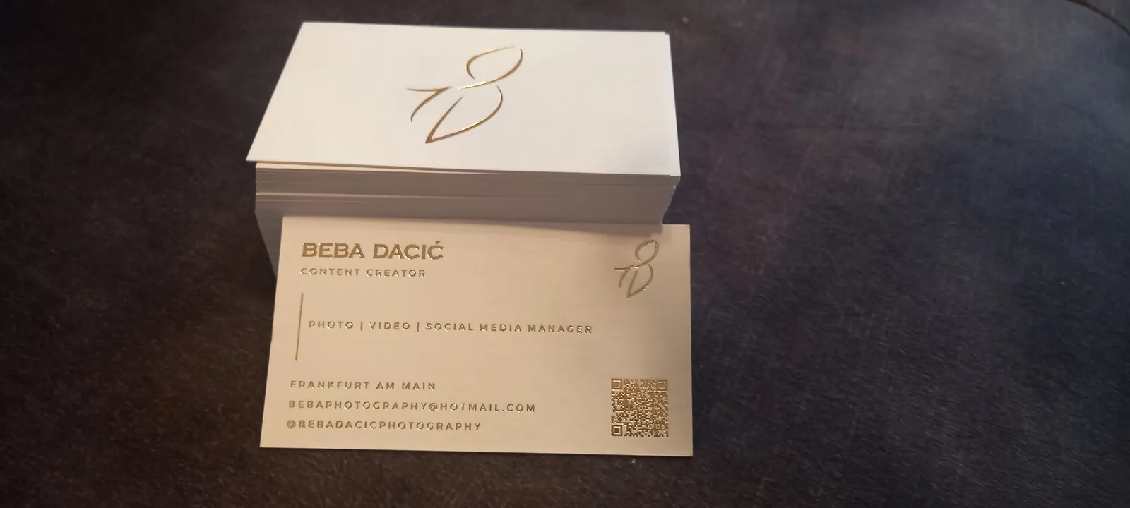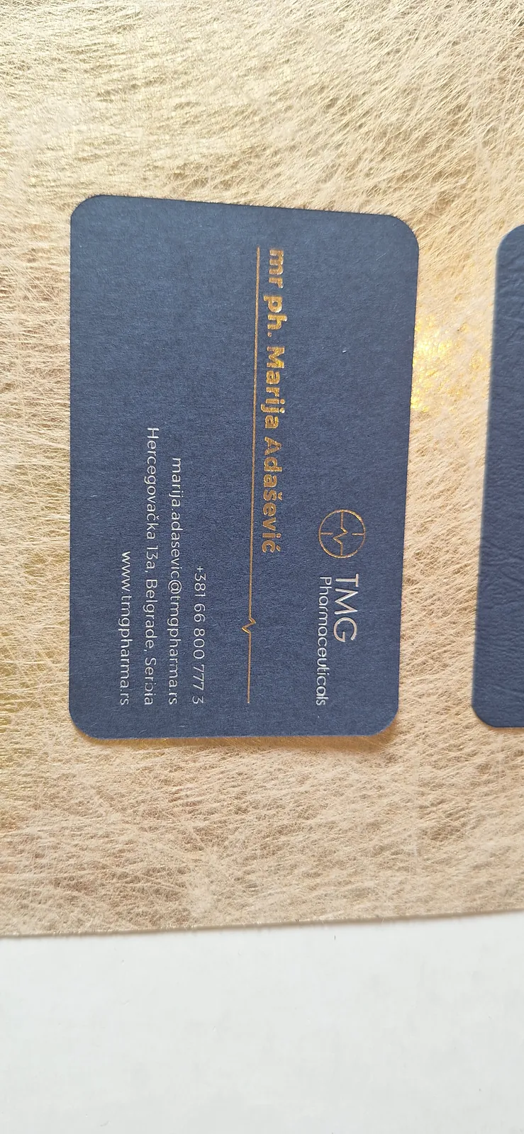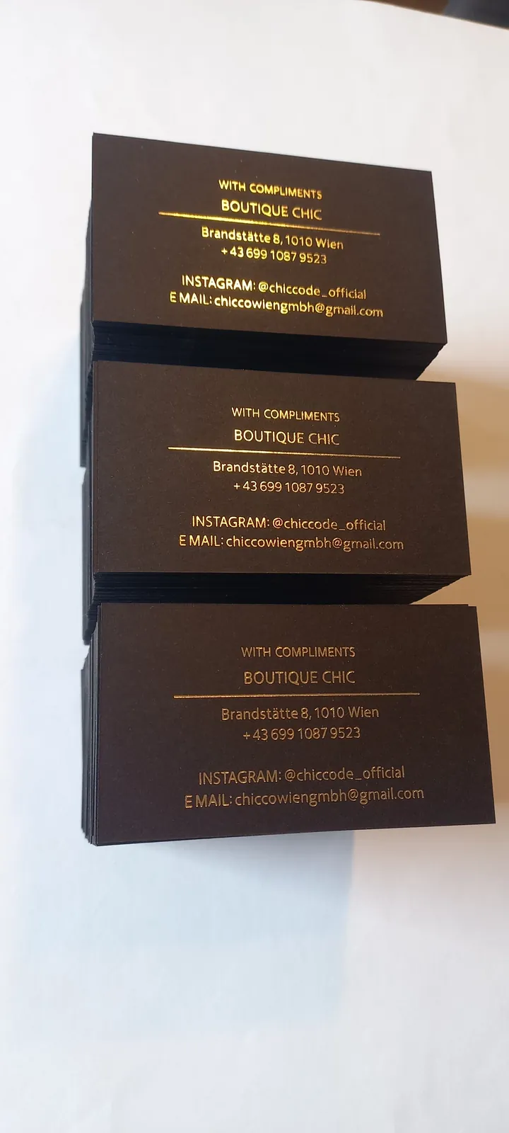 Za vizit karte sa zlatotiskom postali smo pravi stručnjaci, jer godinama najviše radimo baš ovakve vizit karte. Za ove otmene i luksuzne vizit karte u zlatotisku, obavezno se koriste italijanski papiri, boje po želji: bela, bež, crna u zadnje vreme najpopularnija, zelena, ljubičasta, bordo, teget...Grafičku pripremu vam možemo uraditi mi. Ukoliko želite vizit karte u zlatotisku, neophodna je priprema u vektorskom formatu, jer se po njoj prave klišei, a slova se otiskuju u zlatnoj foliji pod viskom temperaturom. Slova imaju izuzetan sjaj. Što se tiče čvrstine papira, u ovoj varijanti je moguće uraditi štampu i na dosta čvršćem papiru do 450 grama jer ova vrsta štampe to dozvoljava. Kao završnu obradu, predlažemo zaobljene ivice, to je stvar izbora, nekome se sviđa, nekome ne. Ceo tekst može se štampati samo na prednjoj strani, što je povoljnije. Naravno, može biti i obostrani zlatotisak.