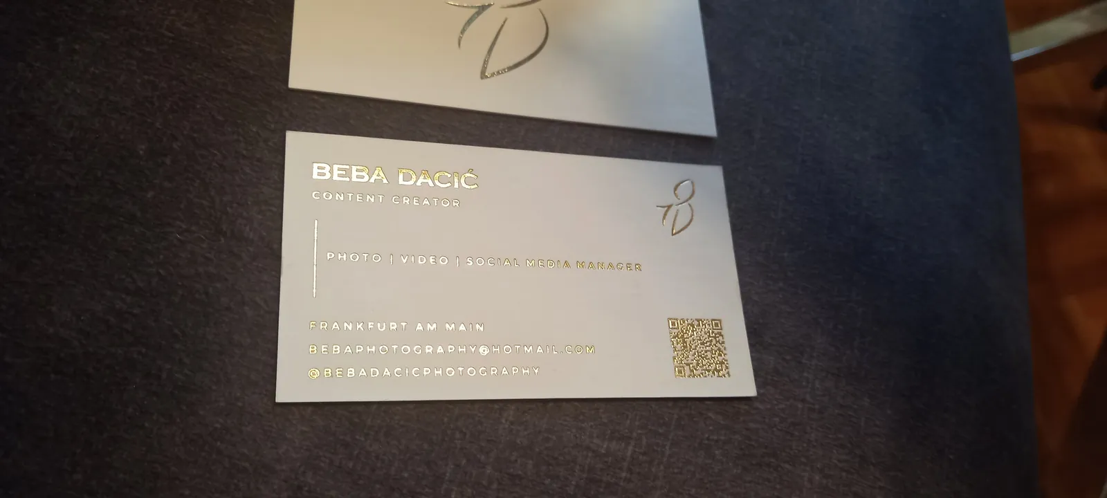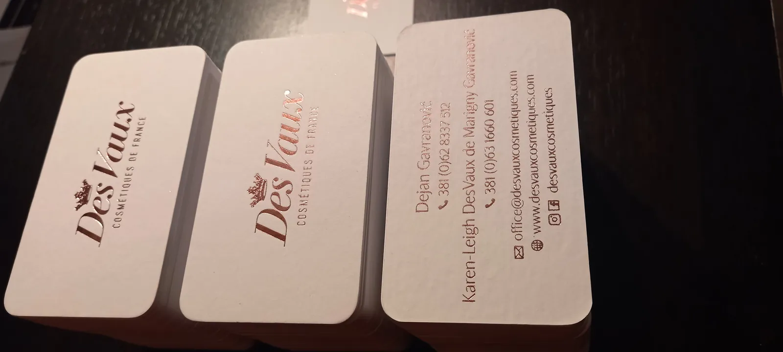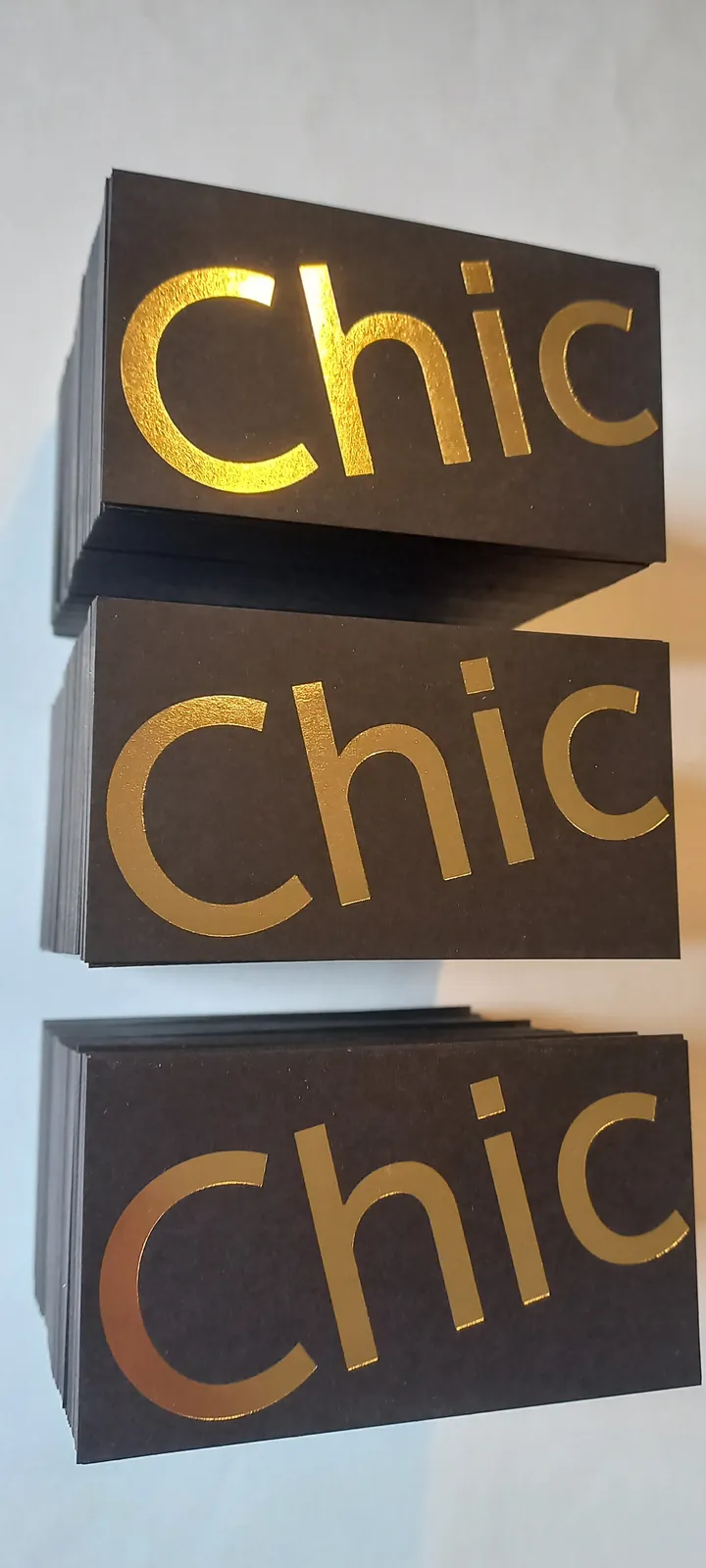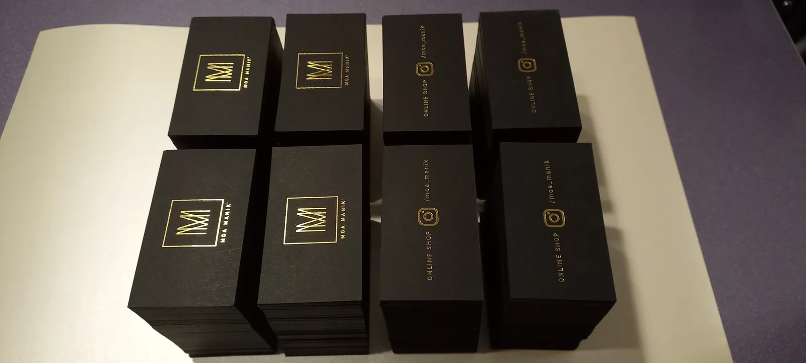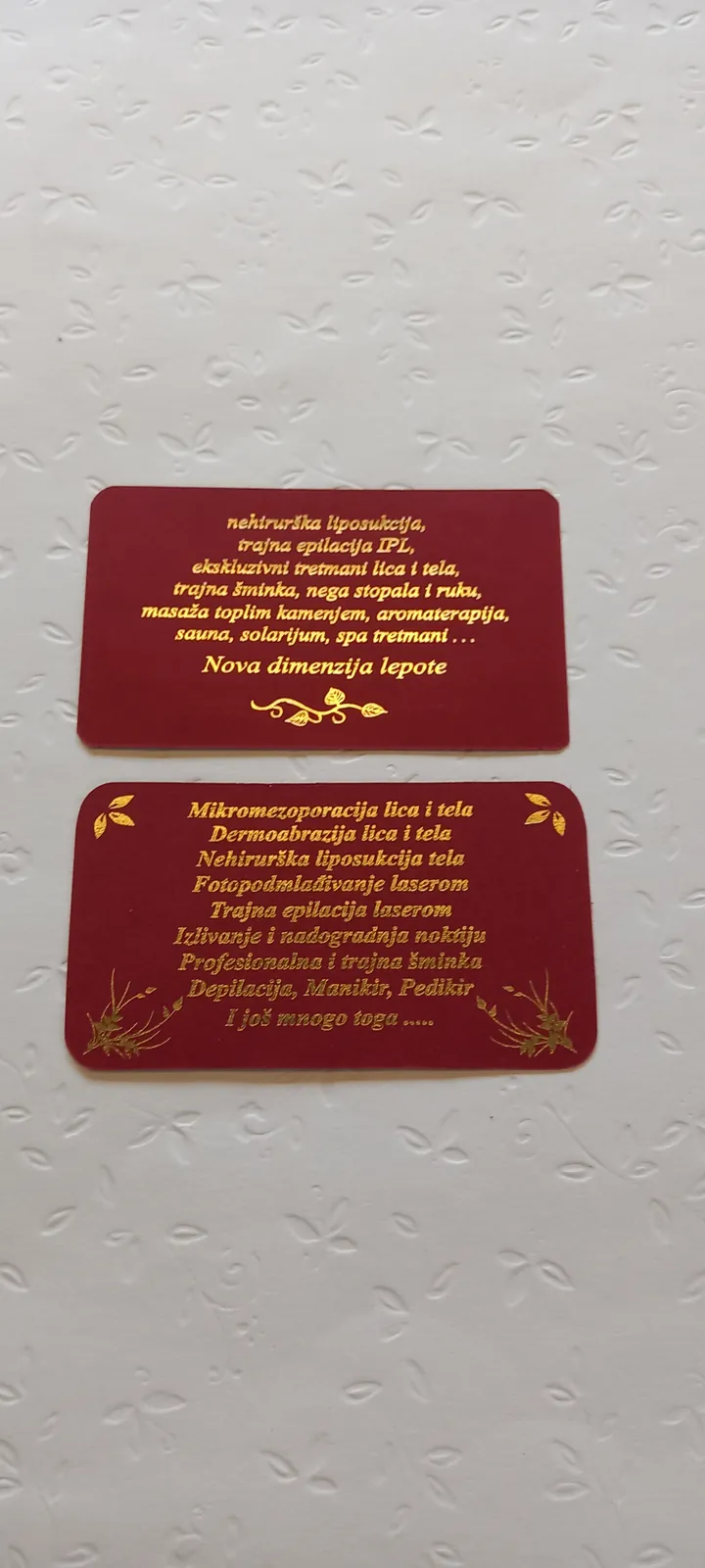 Za vizit karte sa zlatotiskom postali smo pravi stručnjaci, jer godinama najviše radimo baš ovakve vizit karte. Za ove otmene i luksuzne vizit karte u zlatotisku, obavezno se koriste italijanski papiri, boje po želji: bela, bež, crna u zadnje vreme najpopularnija, zelena, ljubičasta, bordo, teget...Grafičku pripremu vam možemo uraditi mi. Ukoliko želite vizit karte u zlatotisku, neophodna je priprema u vektorskom formatu, jer se po njoj prave klišei, a slova se otiskuju u zlatnoj foliji pod viskom temperaturom. Slova imaju izuzetan sjaj. Što se tiče čvrstine papira, u ovoj varijanti je moguće uraditi štampu i na dosta čvršćem papiru do 450 grama jer ova vrsta štampe to dozvoljava. Kao završnu obradu, predlažemo zaobljene ivice, to je stvar izbora, nekome se sviđa, nekome ne. Ceo tekst može se štampati samo na prednjoj strani, što je povoljnije. Naravno, može biti i obostrani zlatotisak.