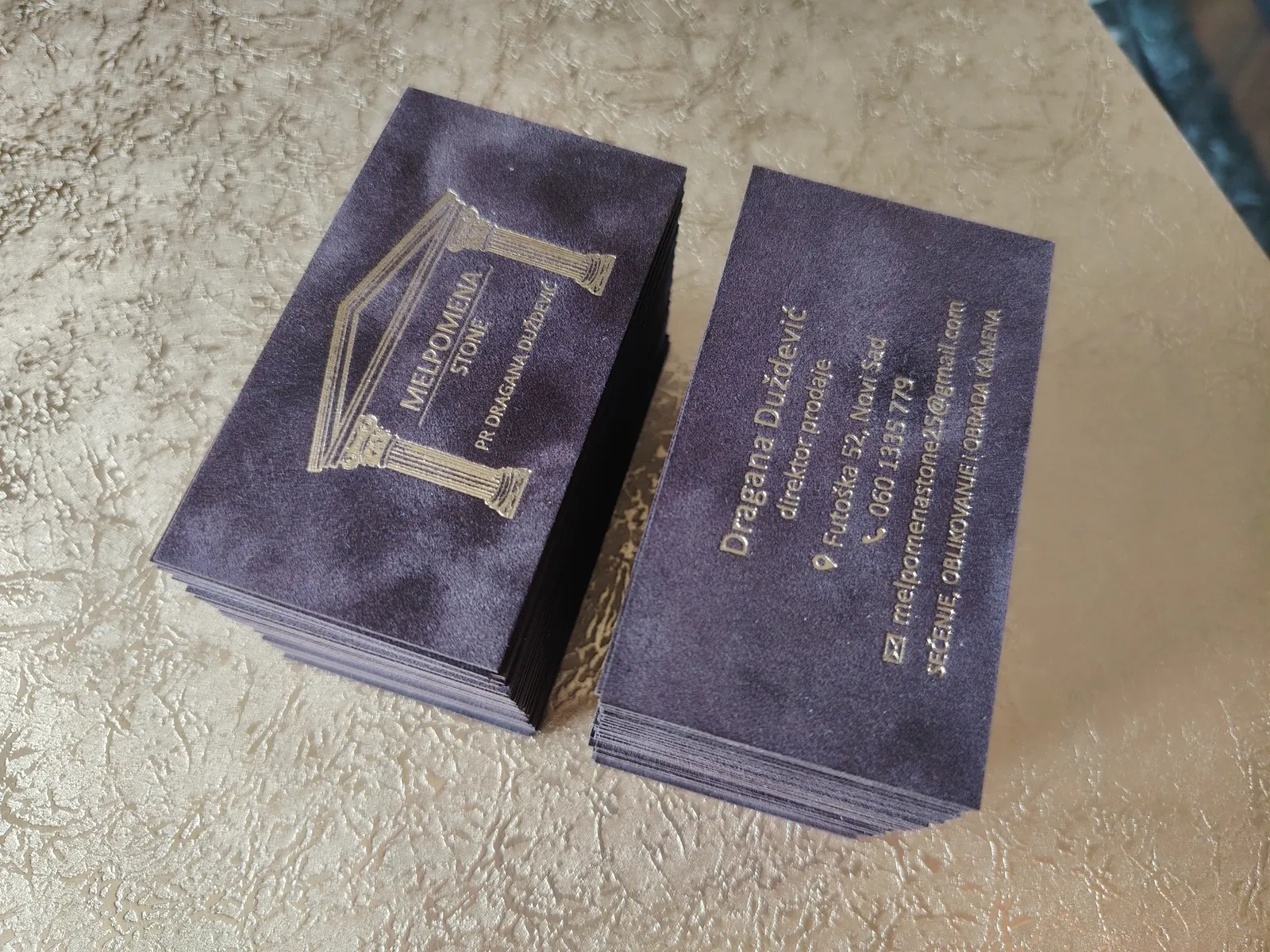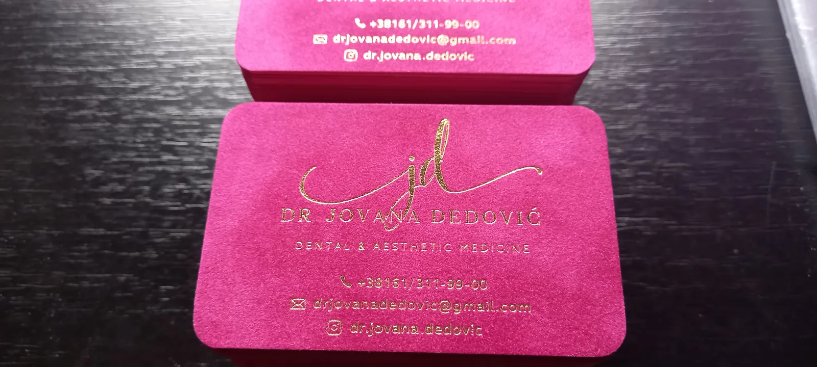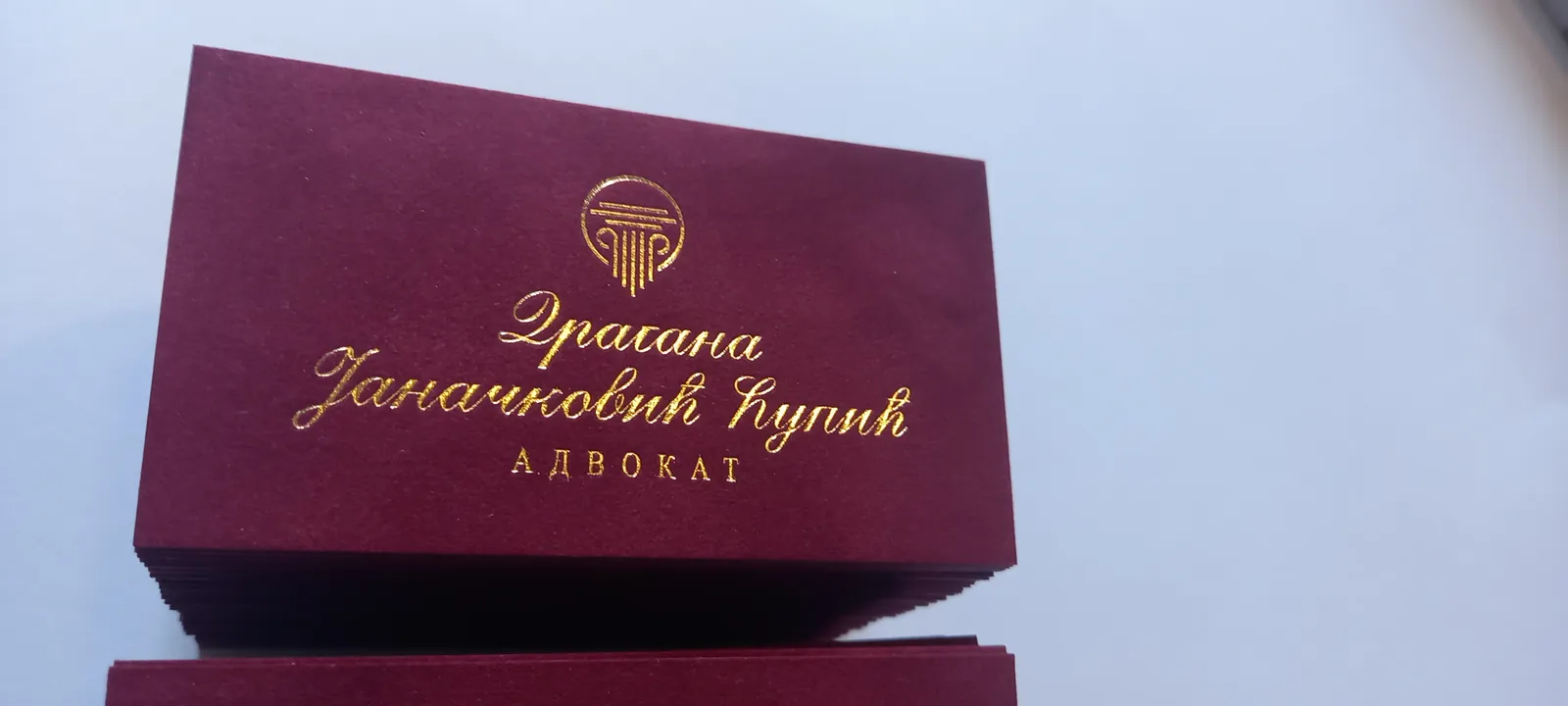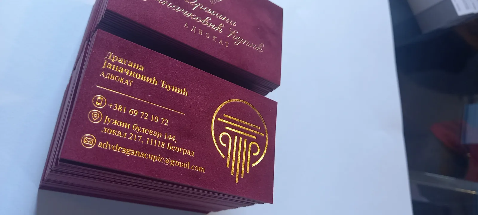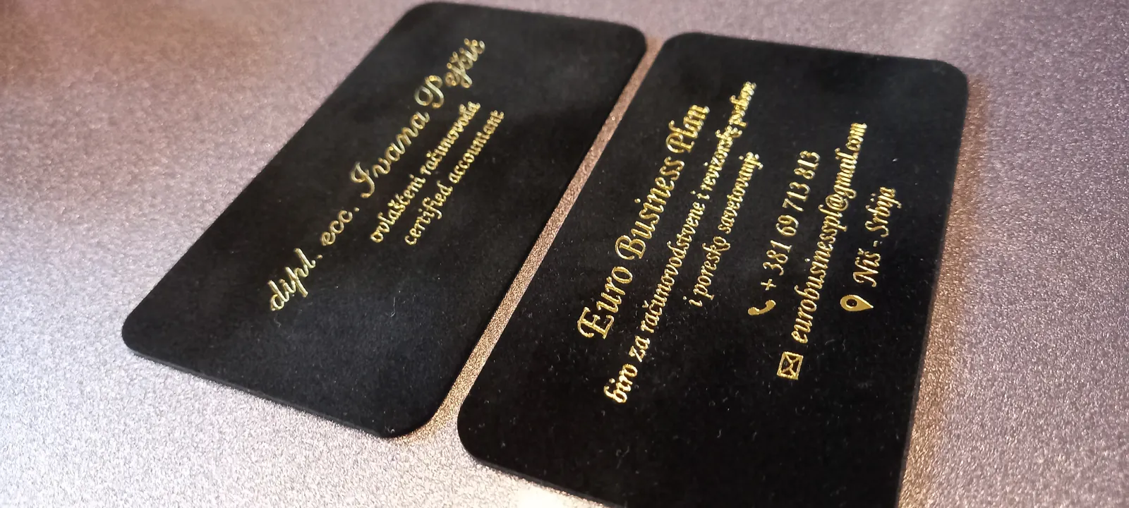 Kada neko zaista želi da bude neobičan sa svojim vizit kartama, neka se odluči za otmene, luksuzne plišane vizit karte! Klijenti mogu odabrati boju pliša, ima ga u svim bojama. Na plišu se radi zlatototisak, srebrotisak ili foliotisak, ne može se raditi obična štampa. Plišane vizit karte takođe su kaširane, čvršće od običnih, lepe se mašinski iz tri sloja. Ponekad kada je logo firme u punom koloru, možemo uraditi i kombinaciju, jedna strana plišana a druga štampana u digitalnoj štampi. Šaljemo plišane vizit karte često u Crnu Goru, Bosnu, Hrvatsku, Švajcarsku, Nemačku jer tamo niko to ne radi!