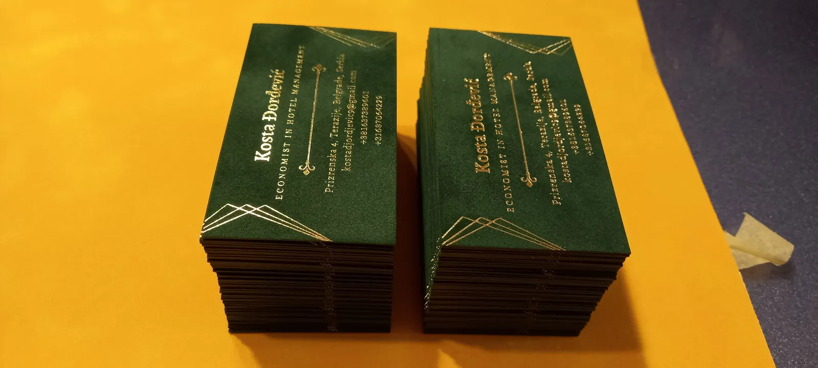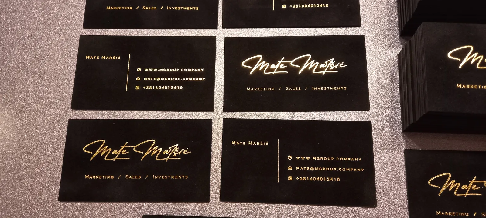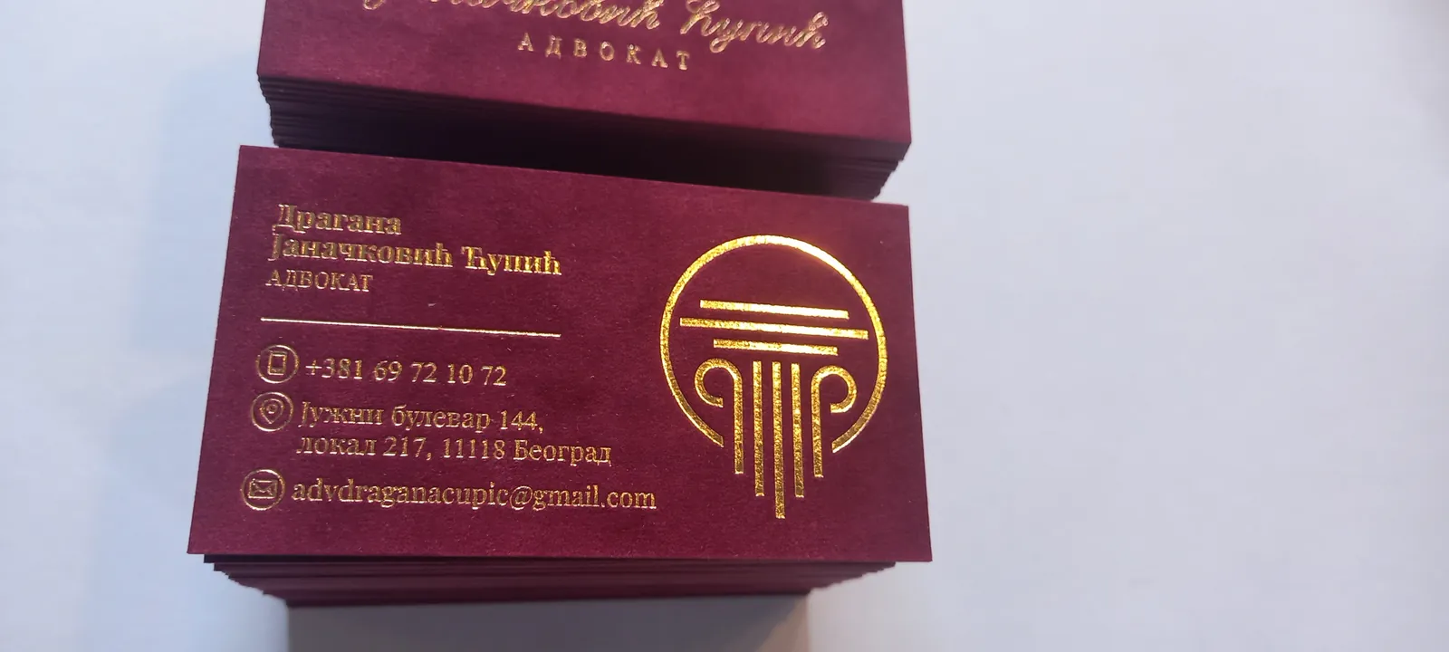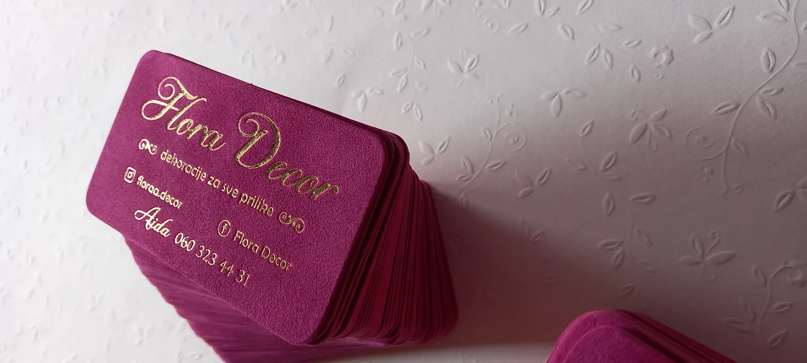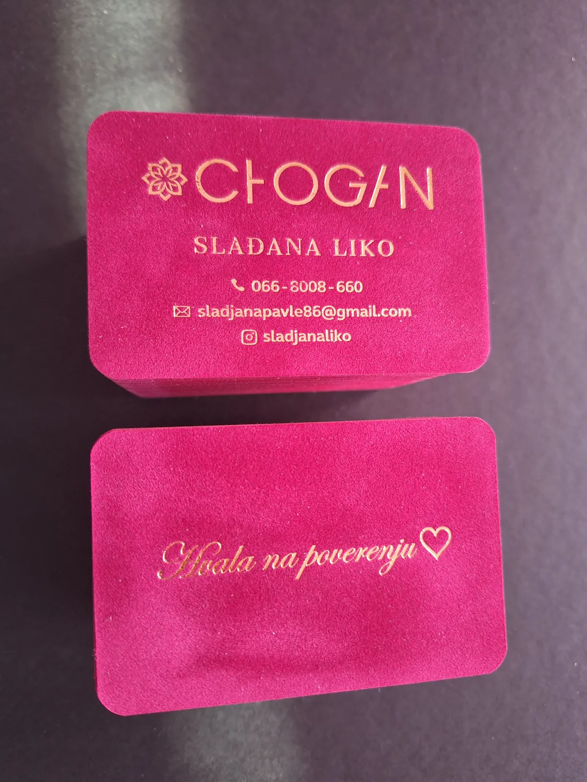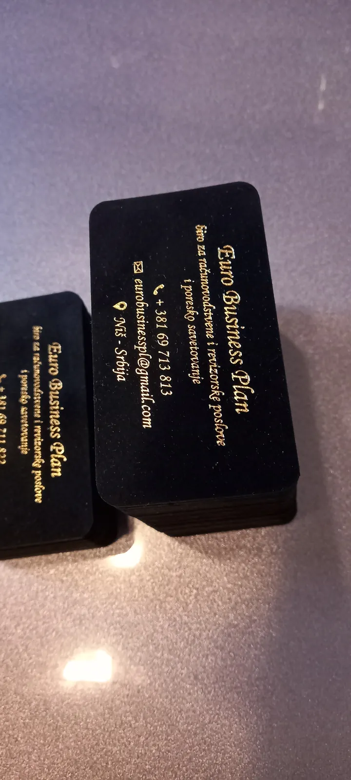Kada neko zaista želi da bude neobičan sa svojim vizit kartama, neka se odluči za otmene, luksuzne plišane vizit karte! Klijenti mogu odabrati boju pliša, ima ga u svim bojama. Na plišu se radi zlatototisak, srebrotisak ili foliotisak, ne može se raditi obična štampa. Plišane vizit karte takođe su kaširane, čvršće od običnih, lepe se mašinski iz tri sloja. Ponekad kada je logo firme u punom koloru, možemo uraditi i kombinaciju, jedna strana plišana a druga štampana u digitalnoj štampi. Šaljemo plišane vizit karte često u Crnu Goru, Bosnu, Hrvatsku, Švajcarsku, Nemačku jer tamo niko to ne radi!