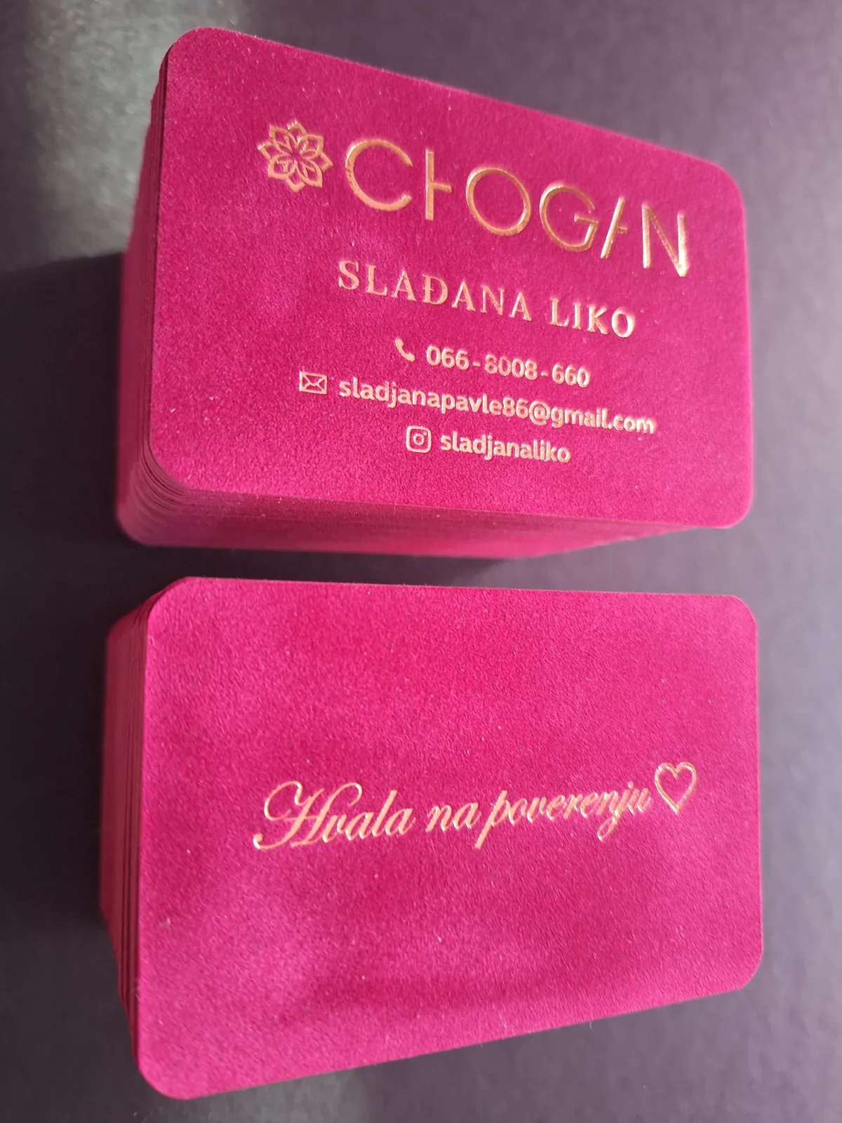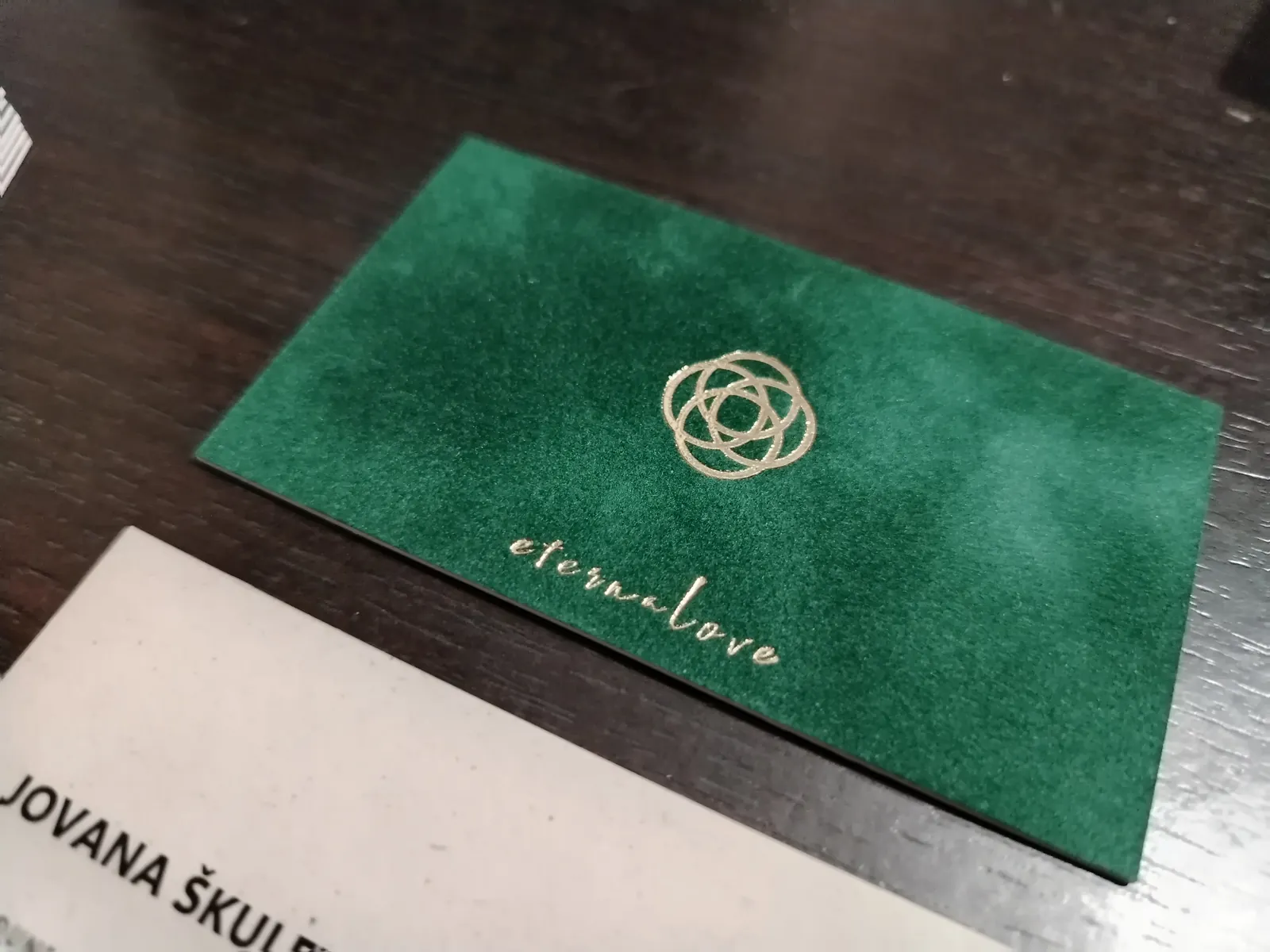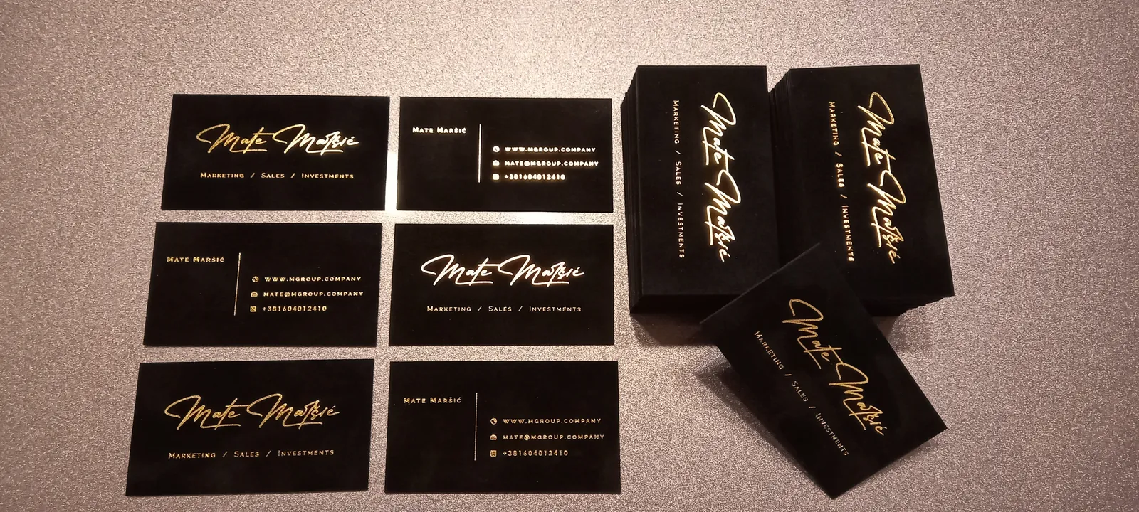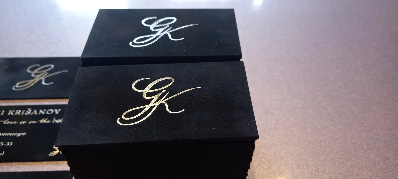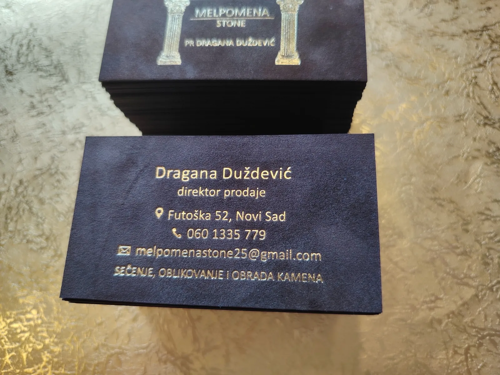 Kada neko zaista želi da bude neobičan sa svojim vizit kartama, neka se odluči za otmene, luksuzne plišane vizit karte! Klijenti mogu odabrati boju pliša, ima ga u svim bojama. Na plišu se radi zlatototisak, srebrotisak ili foliotisak, ne može se raditi obična štampa. Plišane vizit karte takođe su kaširane, čvršće od običnih, lepe se mašinski iz tri sloja. Ponekad kada je logo firme u punom koloru, možemo uraditi i kombinaciju, jedna strana plišana a druga štampana u digitalnoj štampi. Šaljemo plišane vizit karte često u Crnu Goru, Bosnu, Hrvatsku, Švajcarsku, Nemačku jer tamo niko to ne radi!