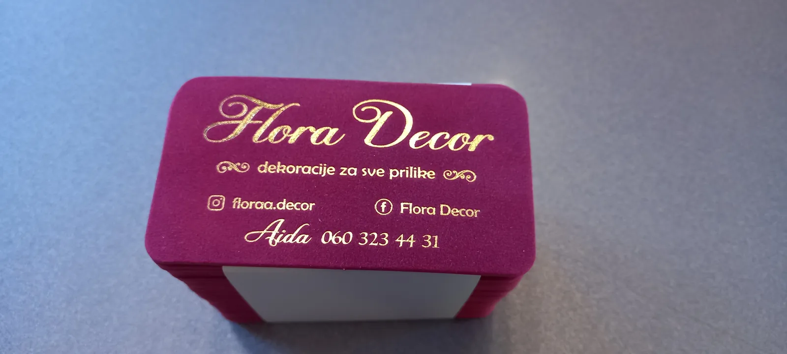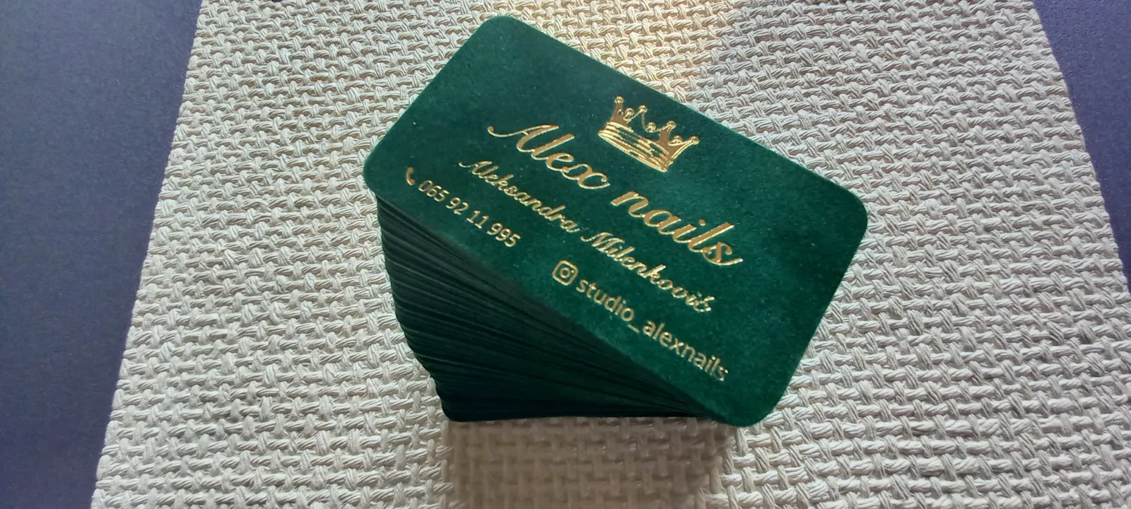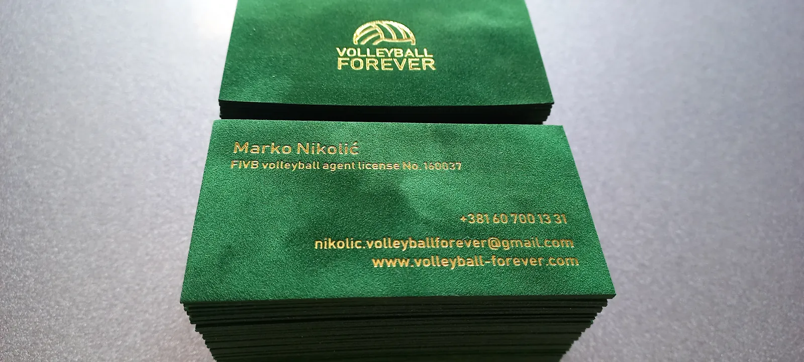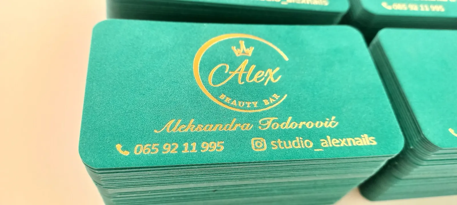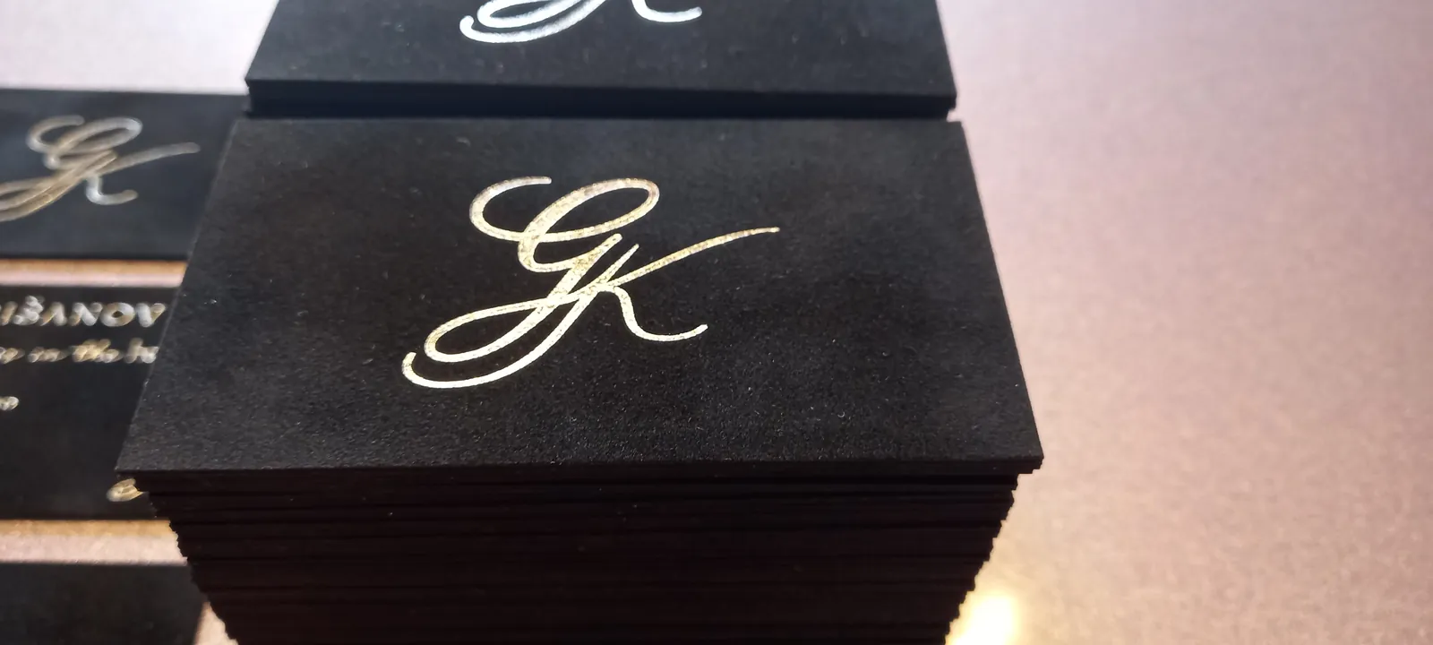 Kada neko zaista želi da bude neobičan sa svojim vizit kartama, neka se odluči za otmene, luksuzne plišane vizit karte! Klijenti mogu odabrati boju pliša, ima ga u svim bojama. Na plišu se radi zlatototisak, srebrotisak ili foliotisak, ne može se raditi obična štampa. Plišane vizit karte takođe su kaširane, čvršće od običnih, lepe se mašinski iz tri sloja. Ponekad kada je logo firme u punom koloru, možemo uraditi i kombinaciju, jedna strana plišana a druga štampana u digitalnoj štampi. Šaljemo plišane vizit karte često u Crnu Goru, Bosnu, Hrvatsku, Švajcarsku, Nemačku jer tamo niko to ne radi!