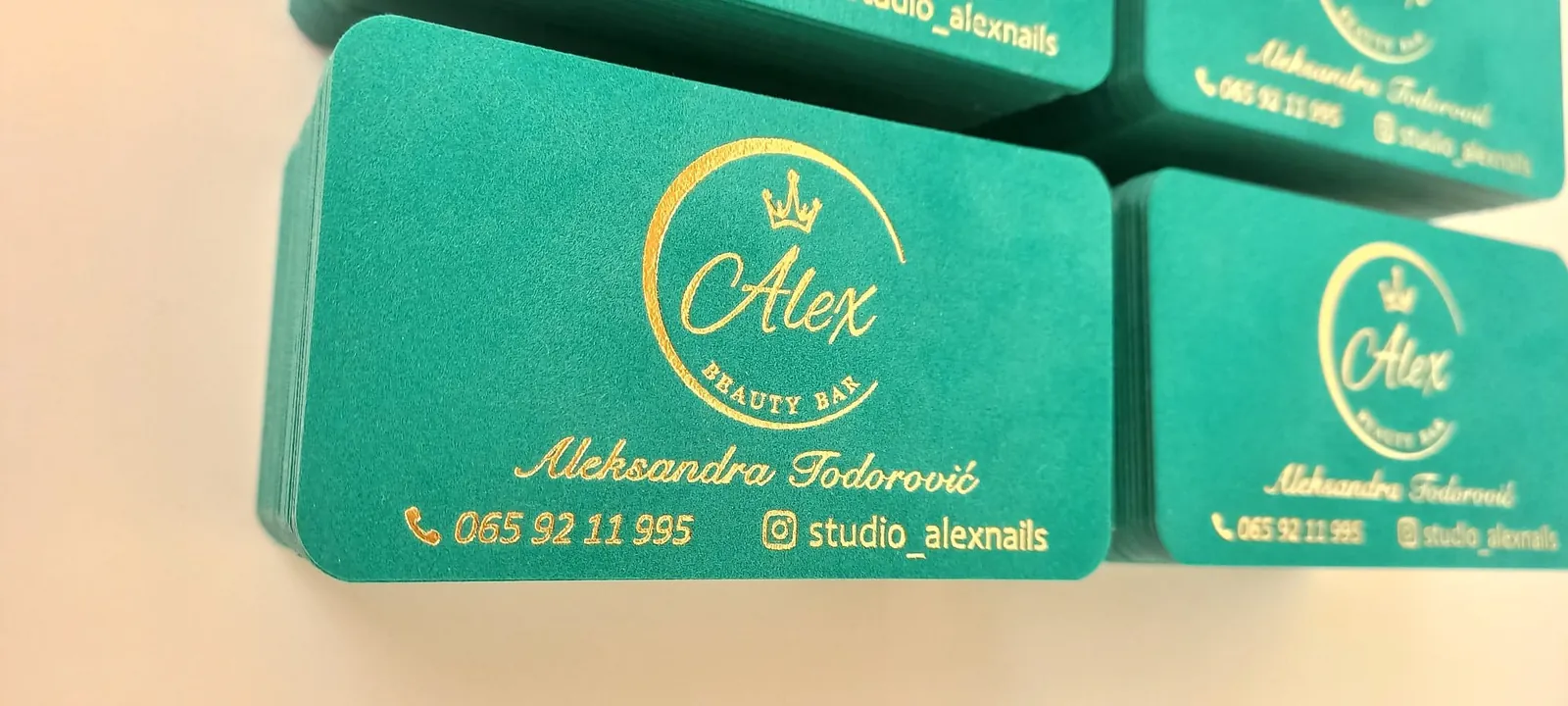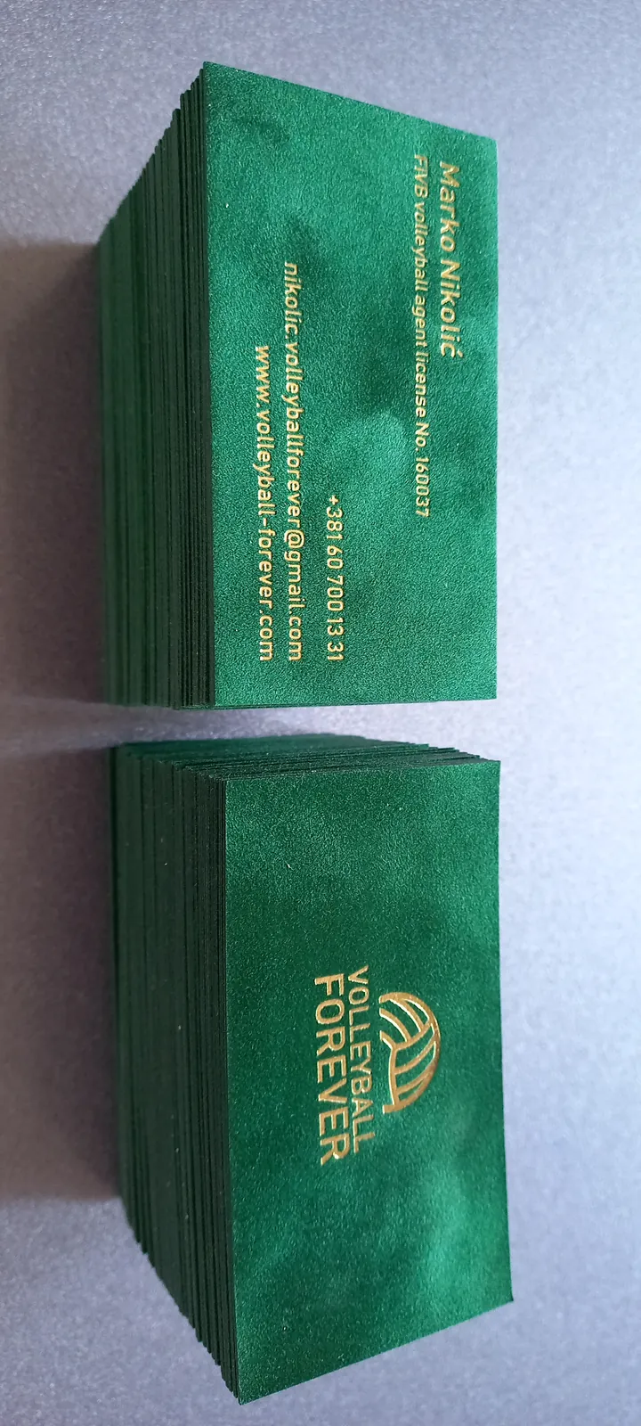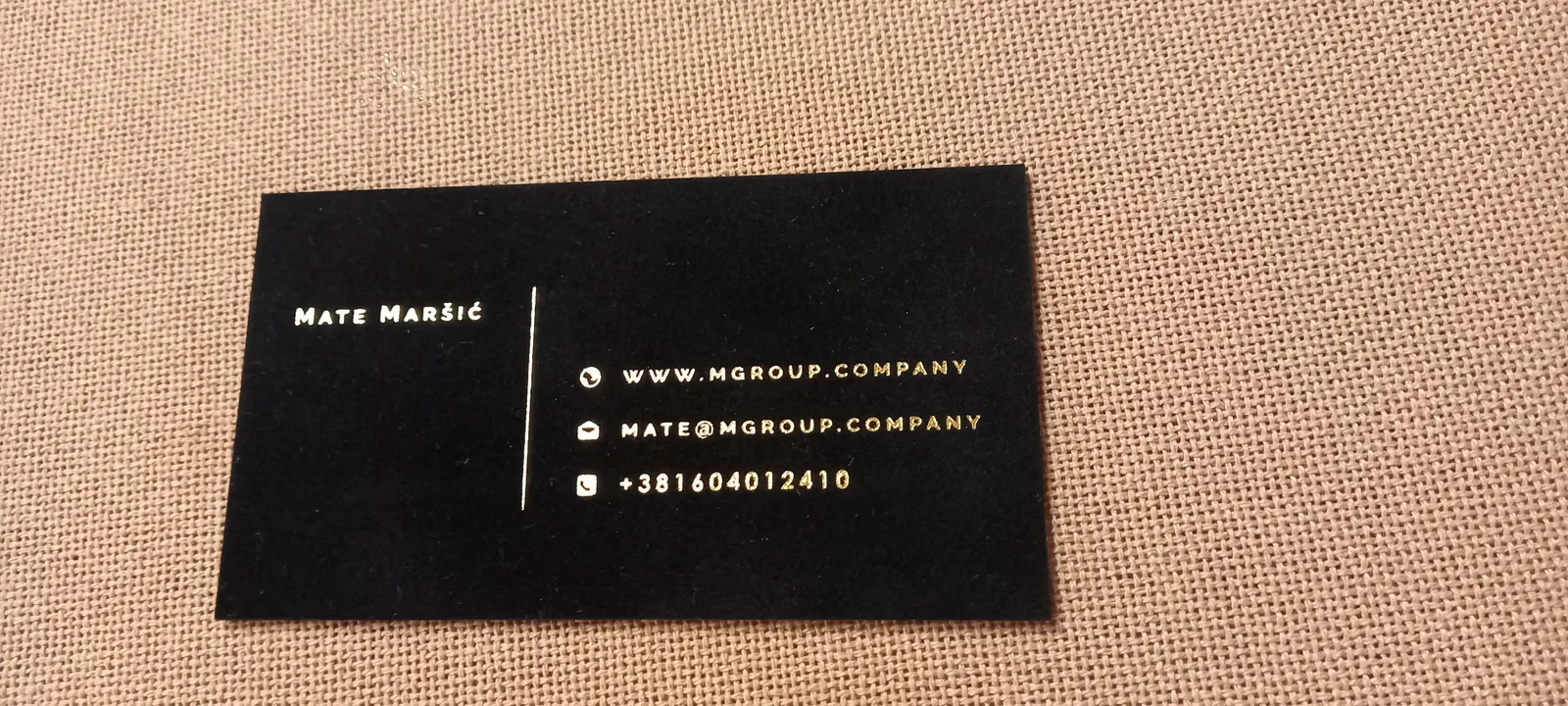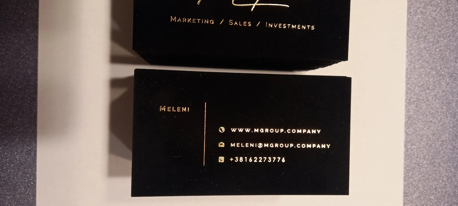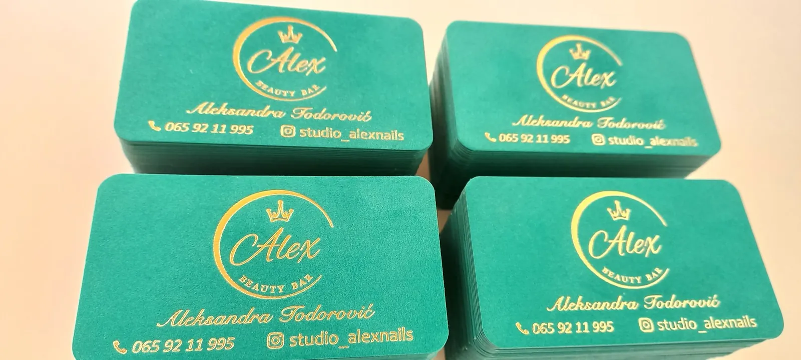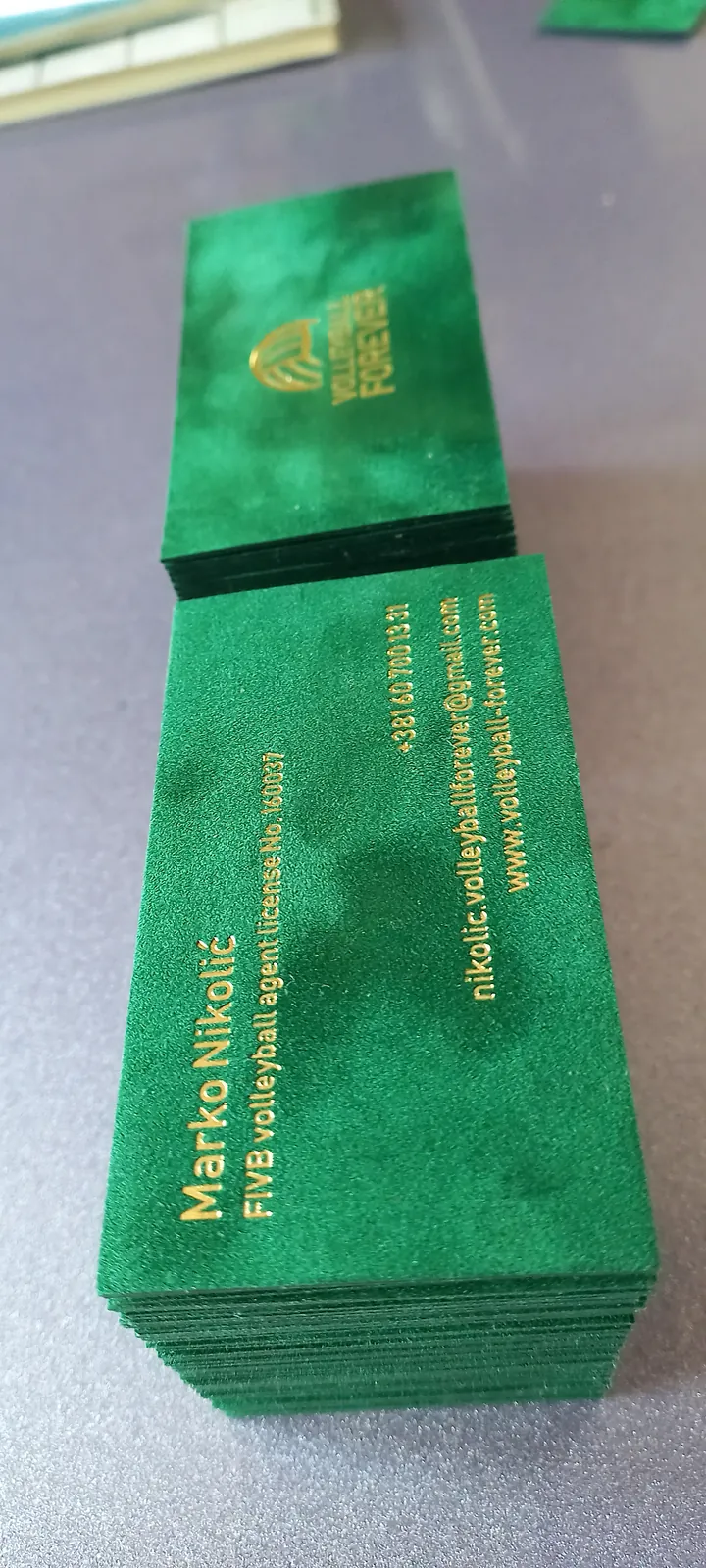 Kada neko zaista želi da bude neobičan sa svojim vizit kartama, neka se odluči za otmene, luksuzne plišane vizit karte! Klijenti mogu odabrati boju pliša, ima ga u svim bojama. Na plišu se radi zlatototisak, srebrotisak ili foliotisak, ne može se raditi obična štampa. Plišane vizit karte takođe su kaširane, čvršće od običnih, lepe se mašinski iz tri sloja. Ponekad kada je logo firme u punom koloru, možemo uraditi i kombinaciju, jedna strana plišana a druga štampana u digitalnoj štampi. Šaljemo plišane vizit karte često u Crnu Goru, Bosnu, Hrvatsku, Švajcarsku, Nemačku jer tamo niko to ne radi!