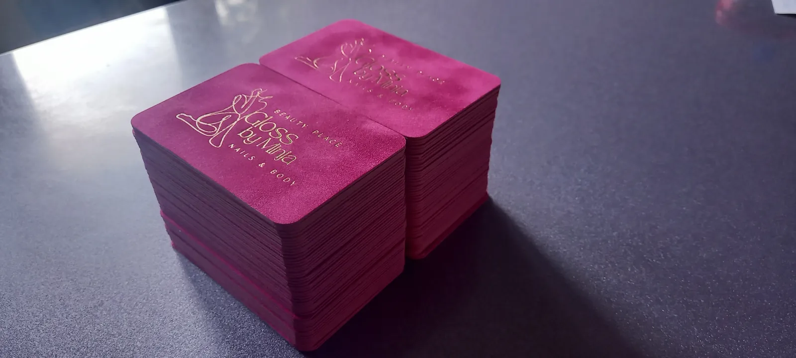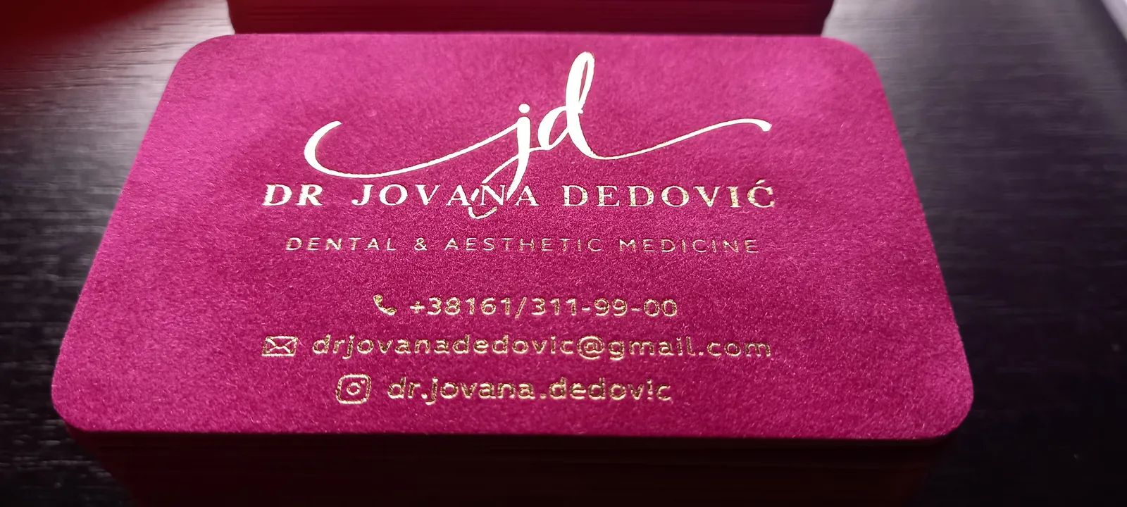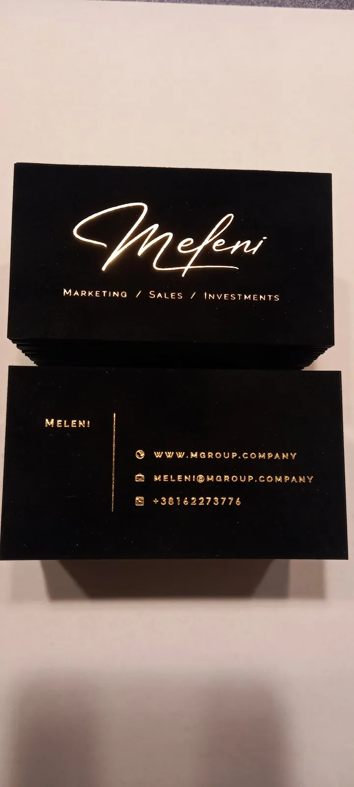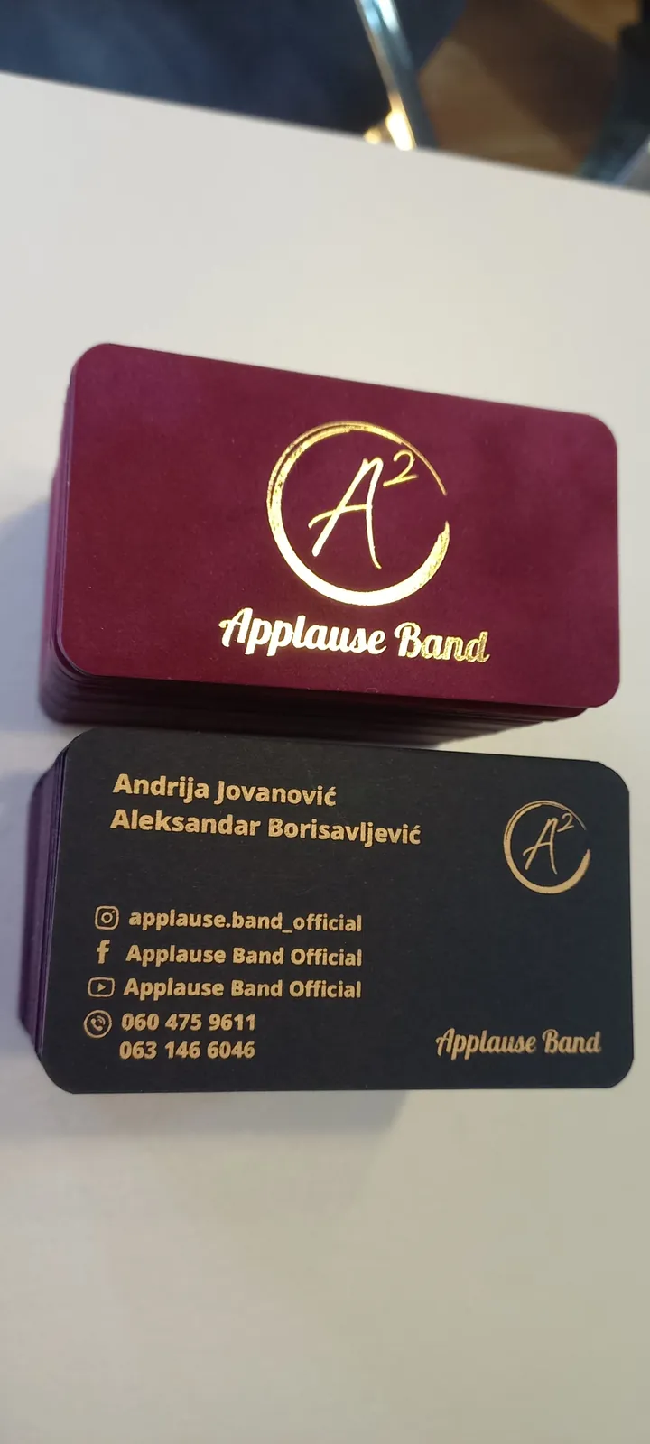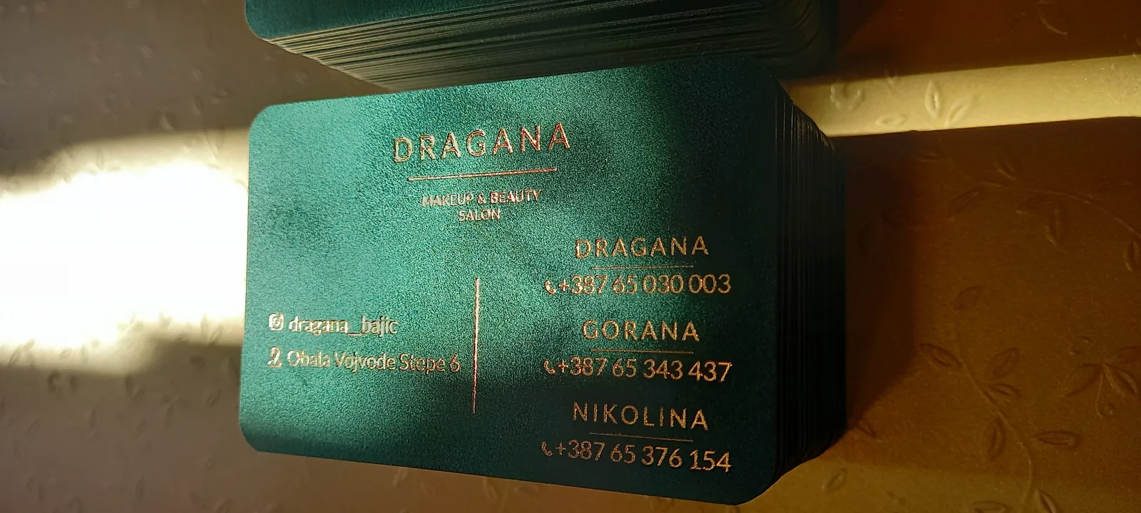 Kada neko zaista želi da bude neobičan sa svojim vizit kartama, neka se odluči za otmene, luksuzne plišane vizit karte! Klijenti mogu odabrati boju pliša, ima ga u svim bojama. Na plišu se radi zlatototisak, srebrotisak ili foliotisak, ne može se raditi obična štampa. Plišane vizit karte takođe su kaširane, čvršće od običnih, lepe se mašinski iz tri sloja. Ponekad kada je logo firme u punom koloru, možemo uraditi i kombinaciju, jedna strana plišana a druga štampana u digitalnoj štampi. Šaljemo plišane vizit karte često u Crnu Goru, Bosnu, Hrvatsku, Švajcarsku, Nemačku jer tamo niko to ne radi!