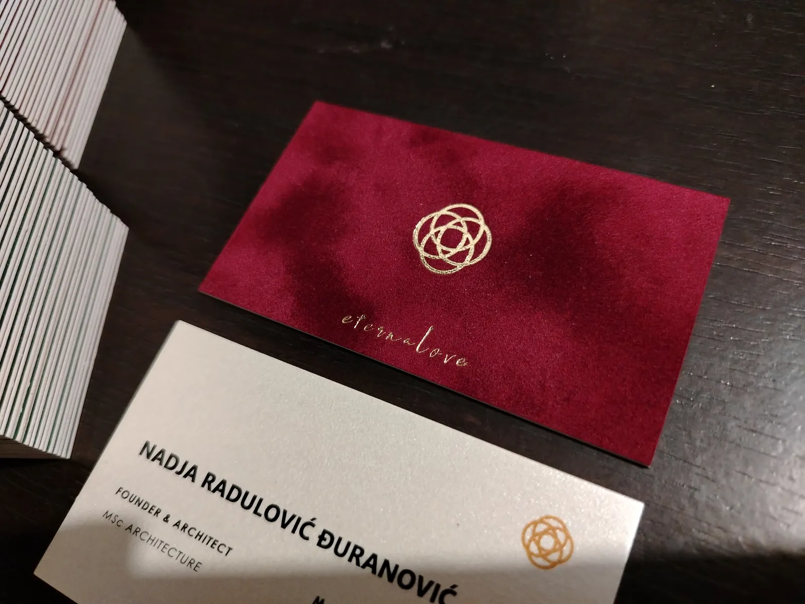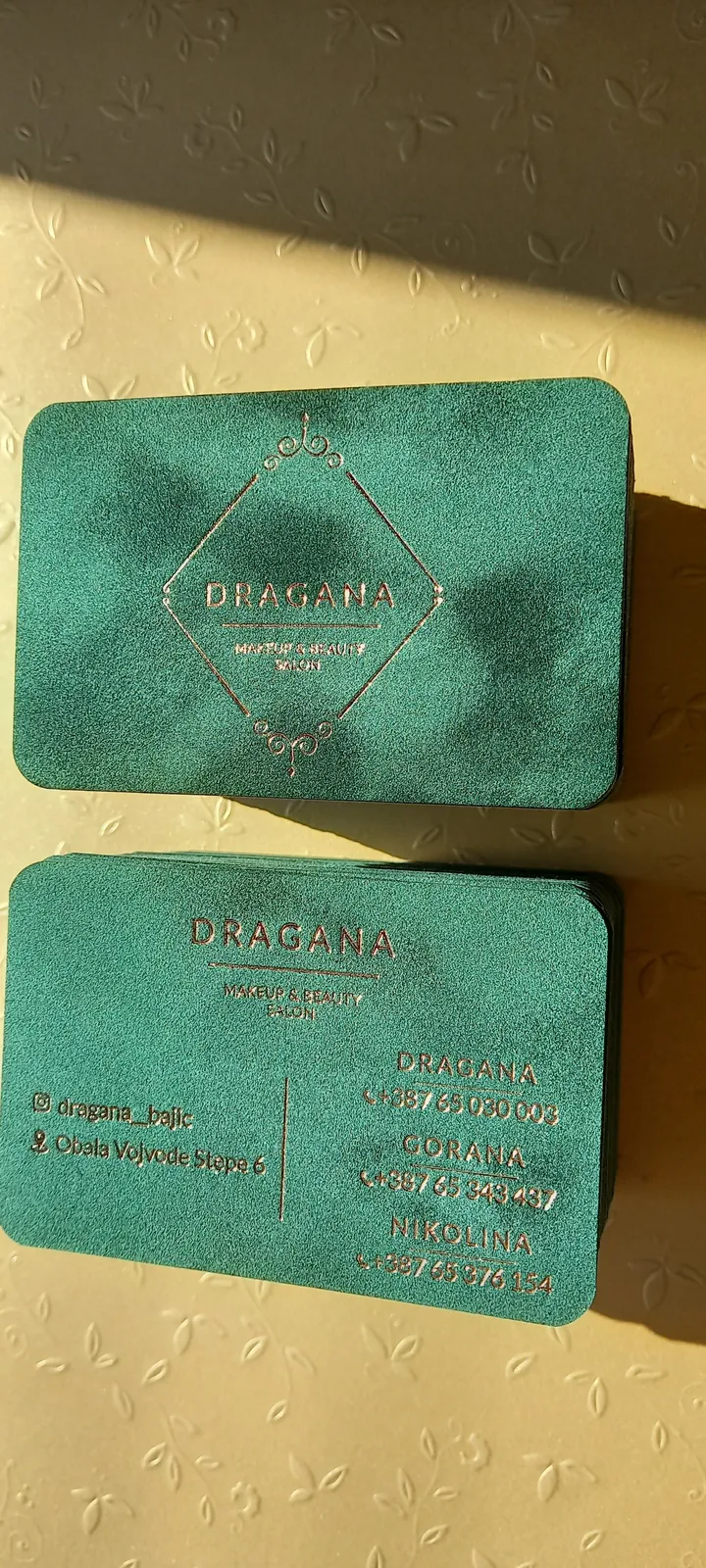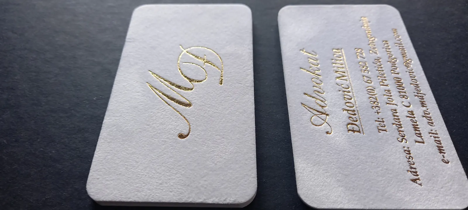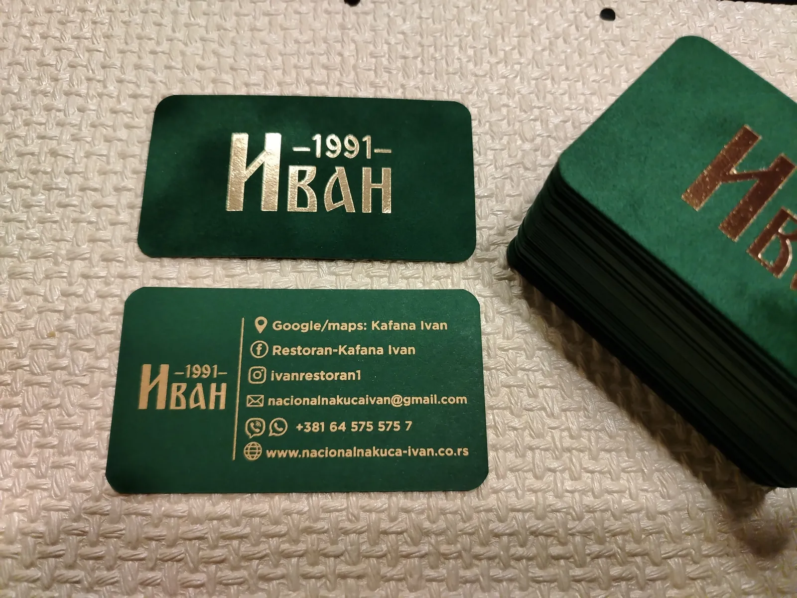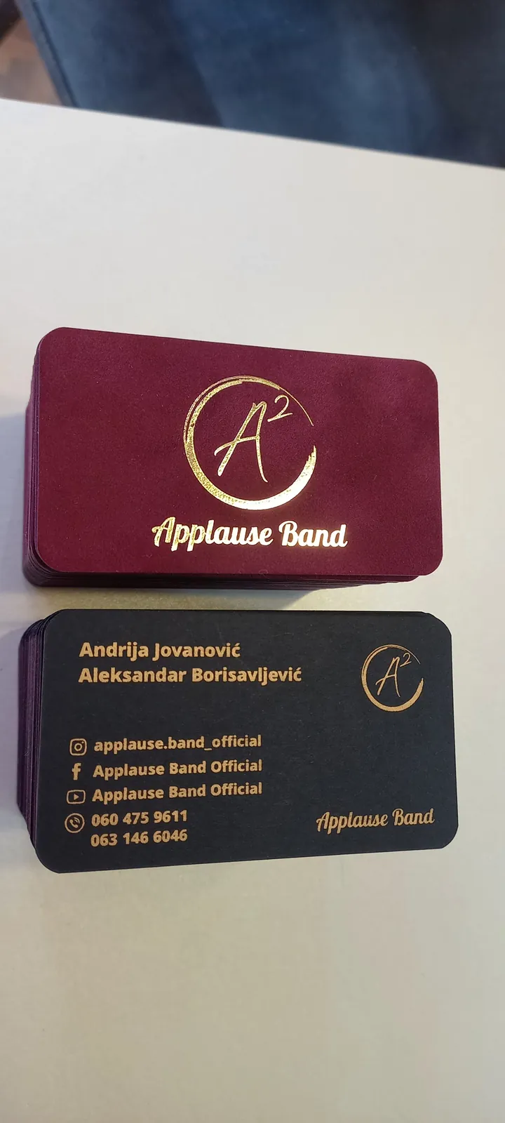 Kada neko zaista želi da bude neobičan sa svojim vizit kartama, neka se odluči za otmene, luksuzne plišane vizit karte! Klijenti mogu odabrati boju pliša, ima ga u svim bojama. Na plišu se radi zlatototisak, srebrotisak ili foliotisak, ne može se raditi obična štampa. Plišane vizit karte takođe su kaširane, čvršće od običnih, lepe se mašinski iz tri sloja. Ponekad kada je logo firme u punom koloru, možemo uraditi i kombinaciju, jedna strana plišana a druga štampana u digitalnoj štampi. Šaljemo plišane vizit karte često u Crnu Goru, Bosnu, Hrvatsku, Švajcarsku, Nemačku jer tamo niko to ne radi!