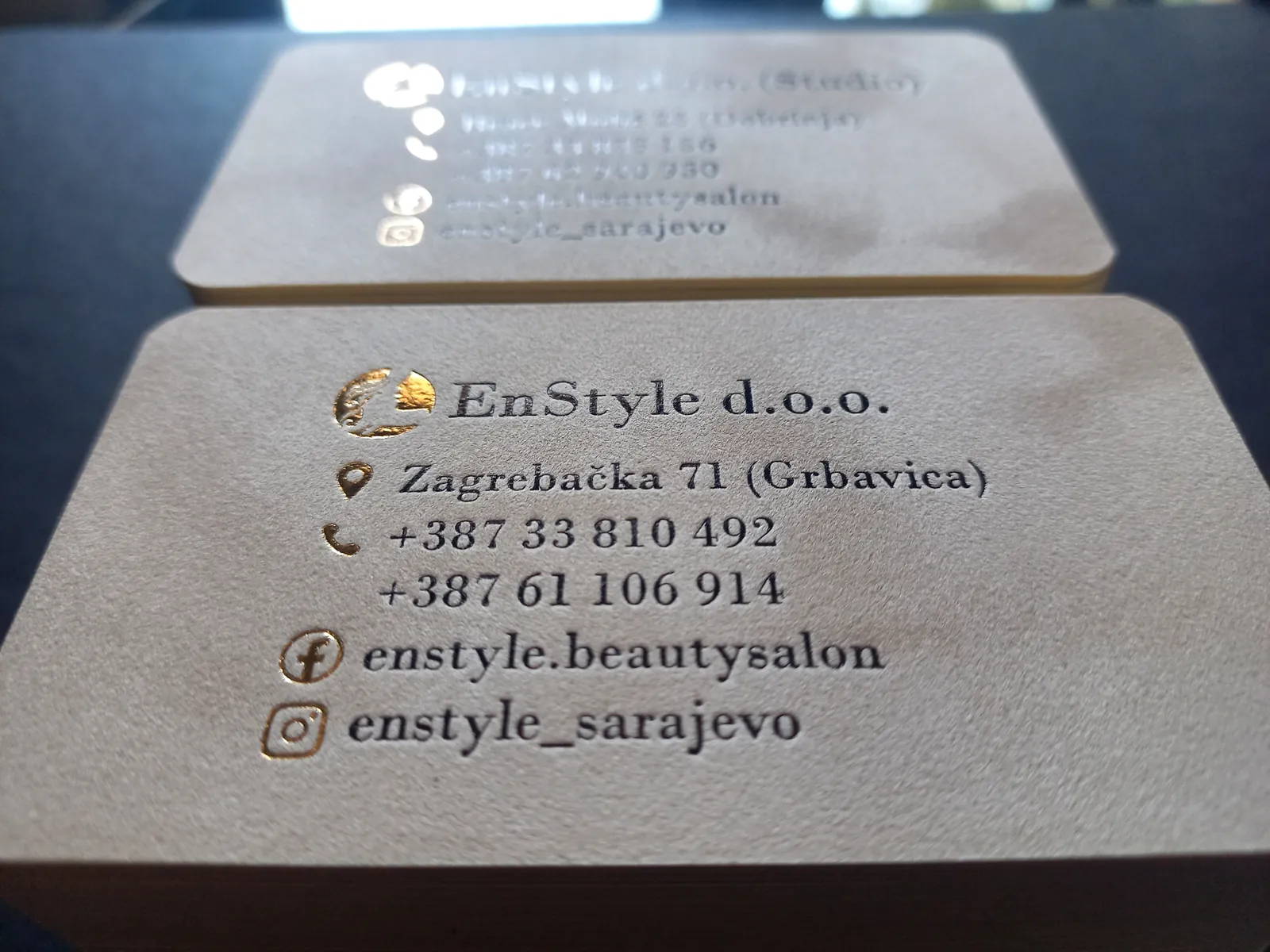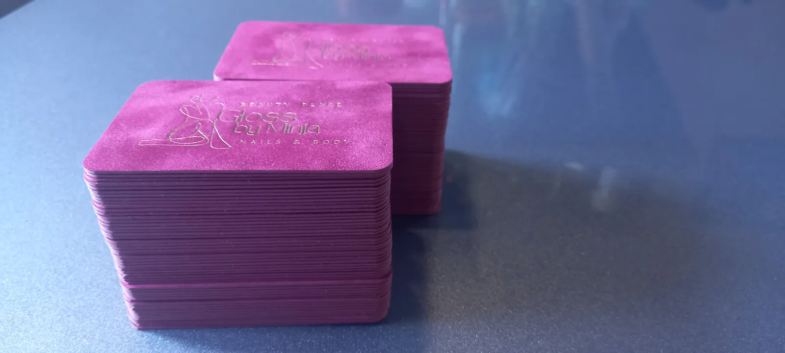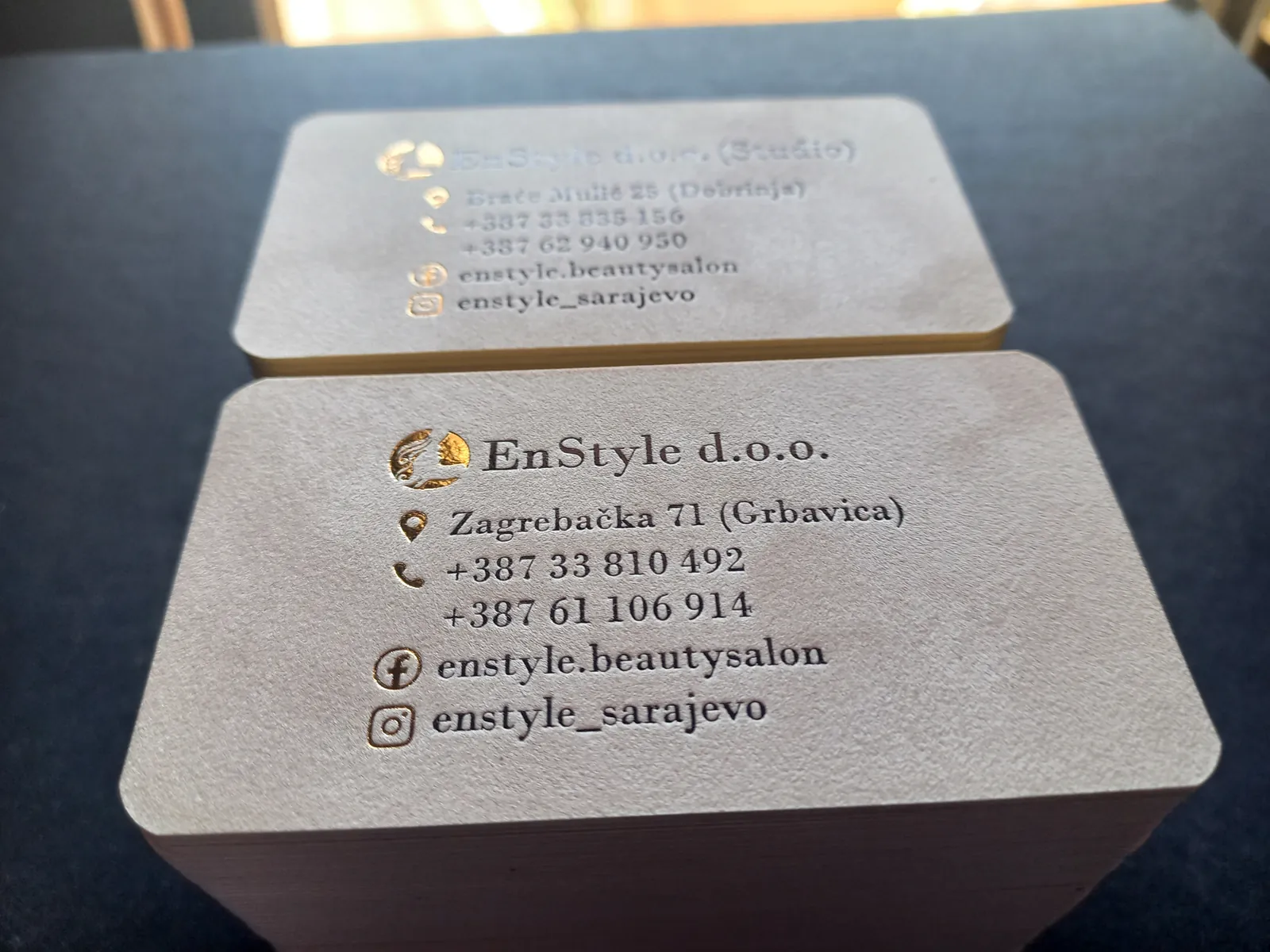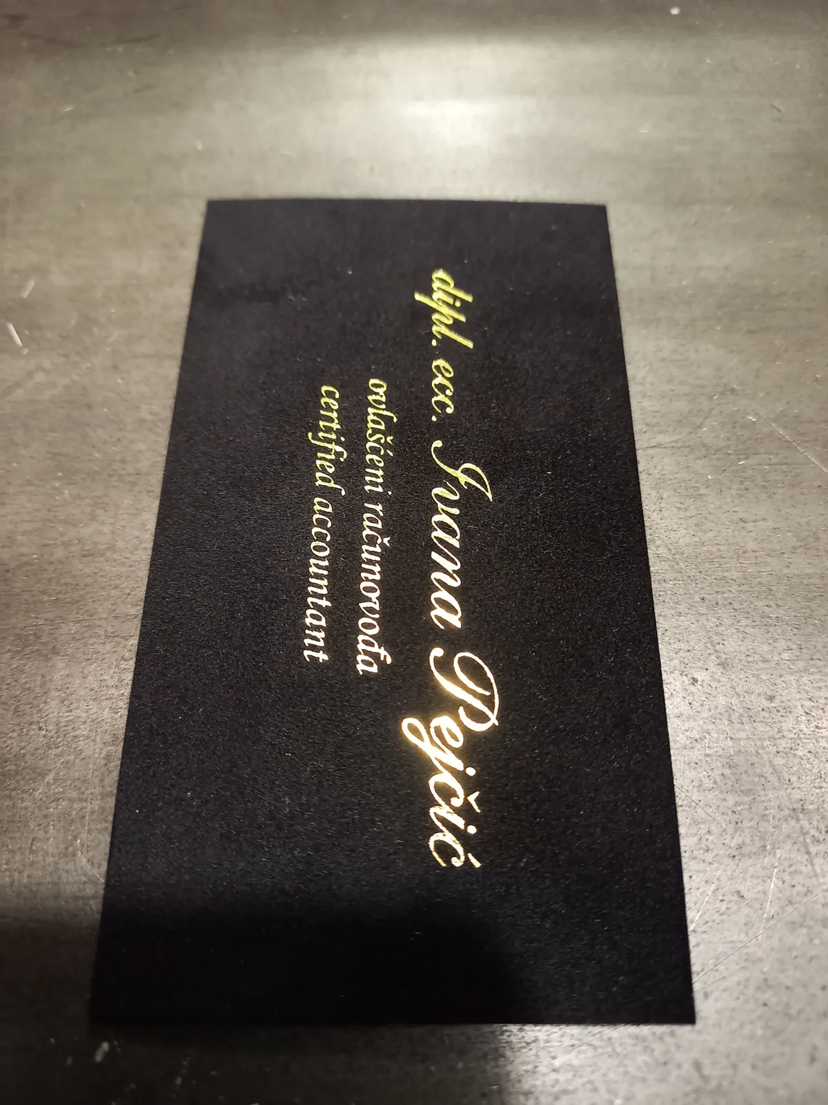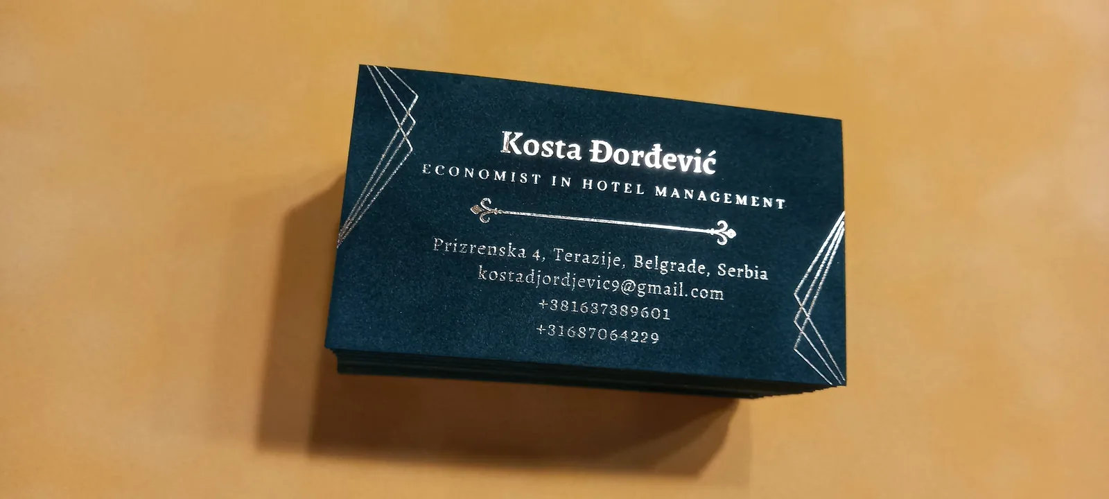 Kada neko zaista želi da bude neobičan sa svojim vizit kartama, neka se odluči za otmene, luksuzne plišane vizit karte! Klijenti mogu odabrati boju pliša, ima ga u svim bojama. Na plišu se radi zlatototisak, srebrotisak ili foliotisak, ne može se raditi obična štampa. Plišane vizit karte takođe su kaširane, čvršće od običnih, lepe se mašinski iz tri sloja. Ponekad kada je logo firme u punom koloru, možemo uraditi i kombinaciju, jedna strana plišana a druga štampana u digitalnoj štampi. Šaljemo plišane vizit karte često u Crnu Goru, Bosnu, Hrvatsku, Švajcarsku, Nemačku jer tamo niko to ne radi!