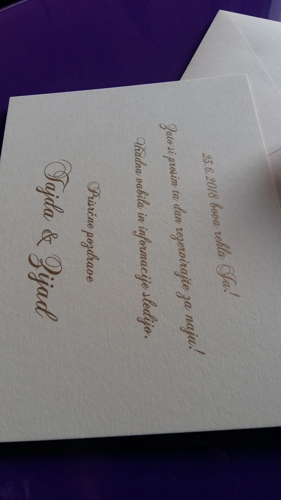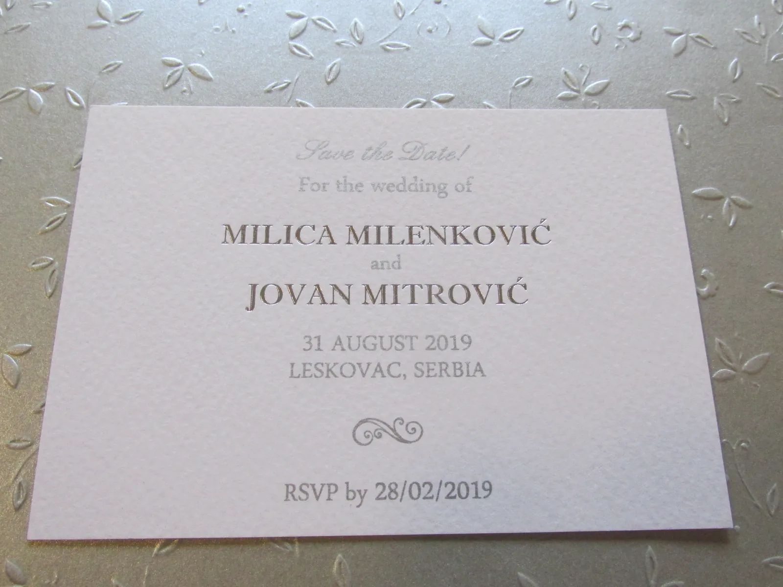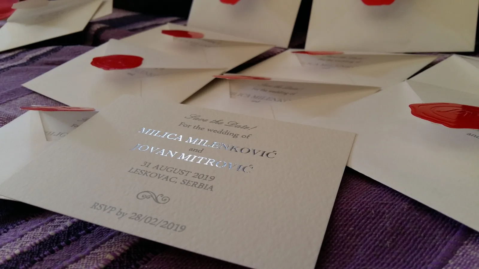 Save the Date – često se godinu dana pre venčanja šalje gostima samo ,,sačuvaj datum’’ kartica pre same pozivnice, kako bi gosti mogli da na vreme planiraju vaše venčanje. Obično je ovakva karta sa kovertom i u stilu same pozivnice, koja će se gostima uručiti kasnije kada se budu znali svi detalji proslave, satnica.