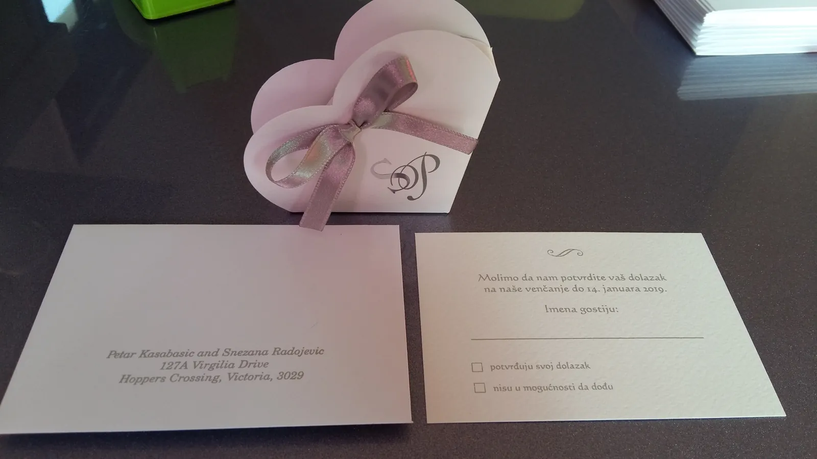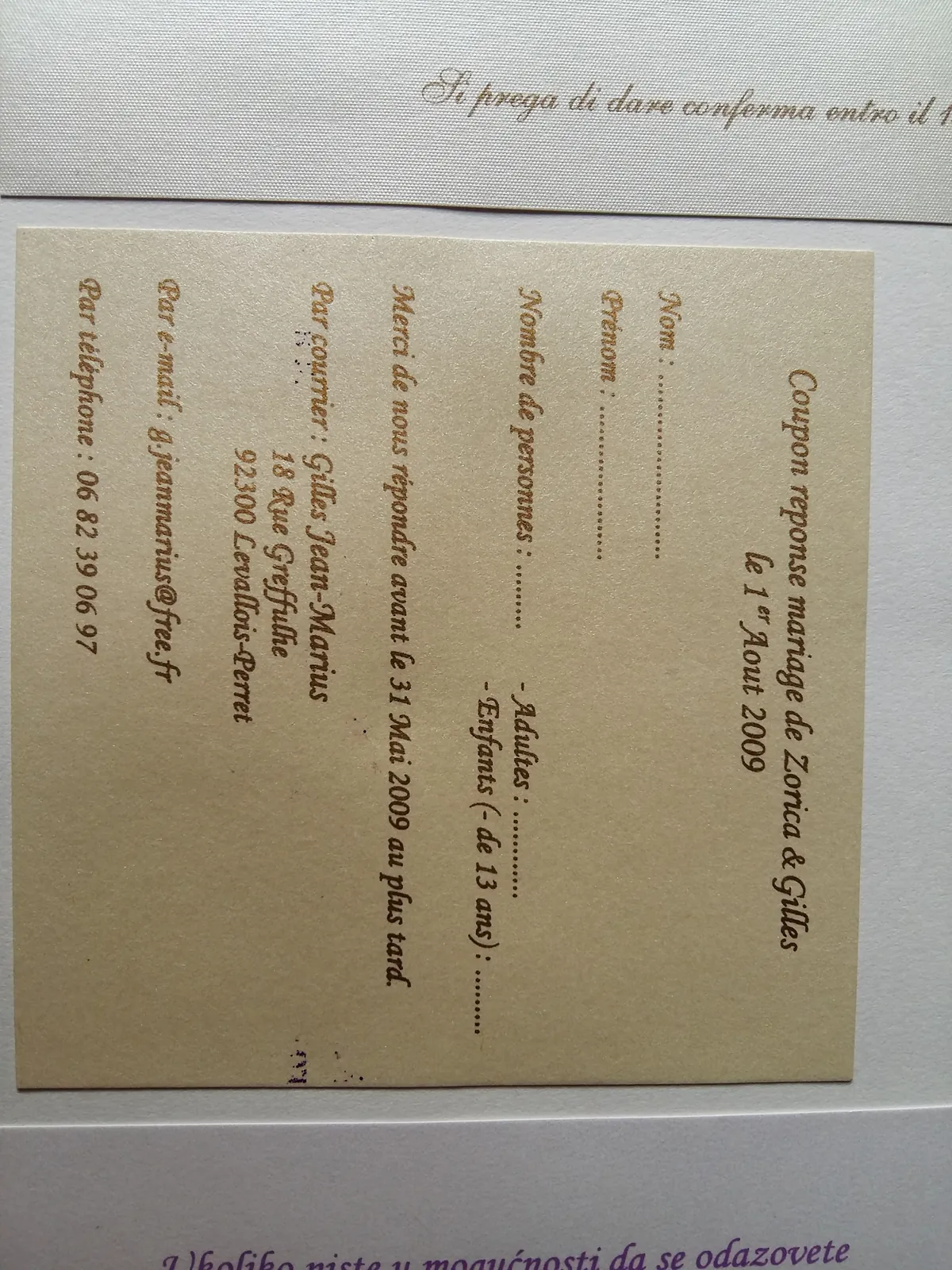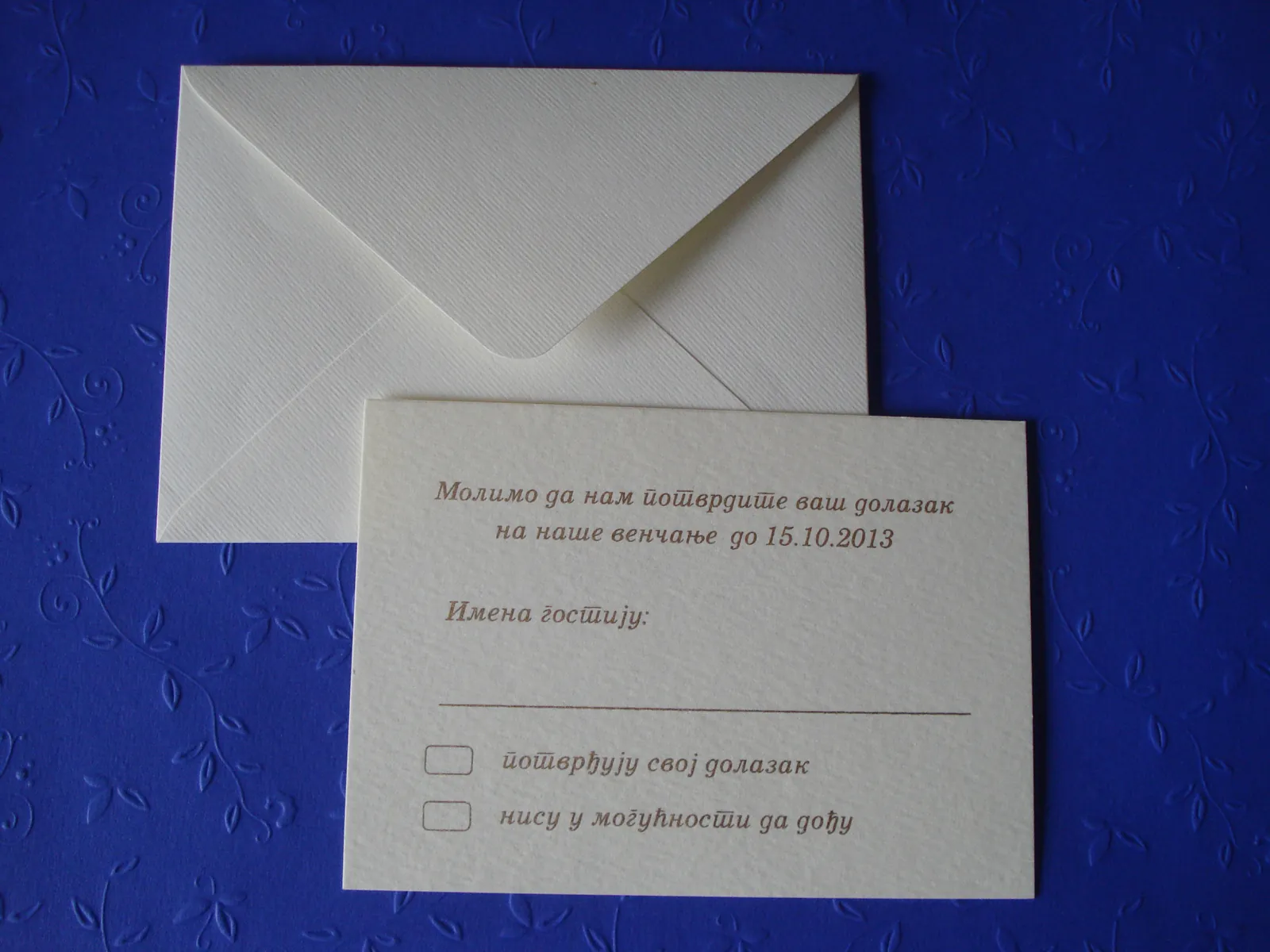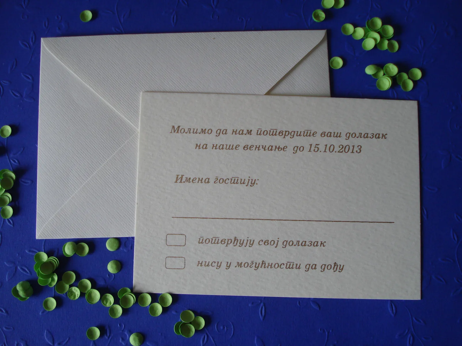 Carte Reponse za klijente iz stranih zemalja, to je kartica u skladu sa pozivnicom, sa kovertom, koja se daje gostima u isto vreme kada i pozivnica. Zvanice samo treba da pošalju nazad vama i da naznače da li dolaze i u kom broju.