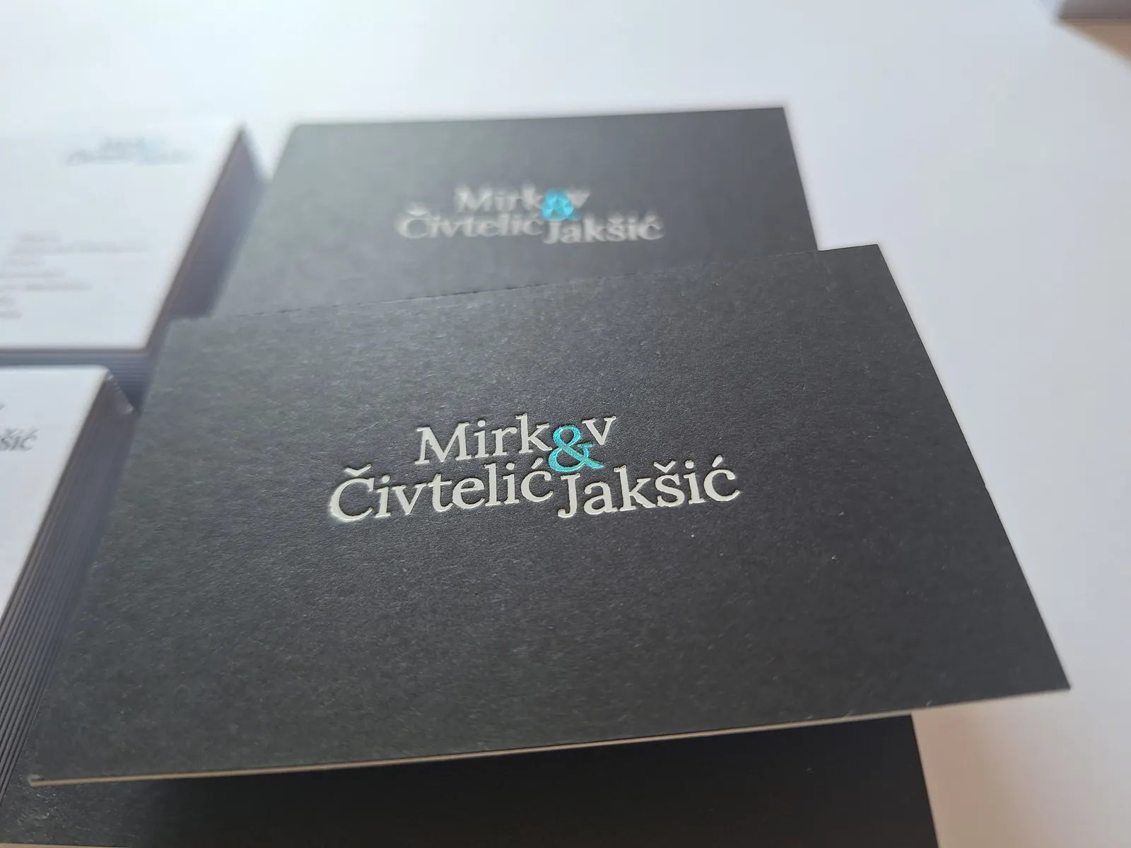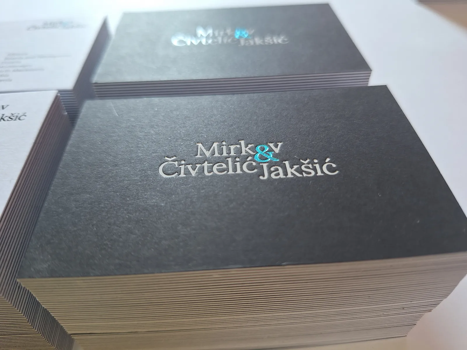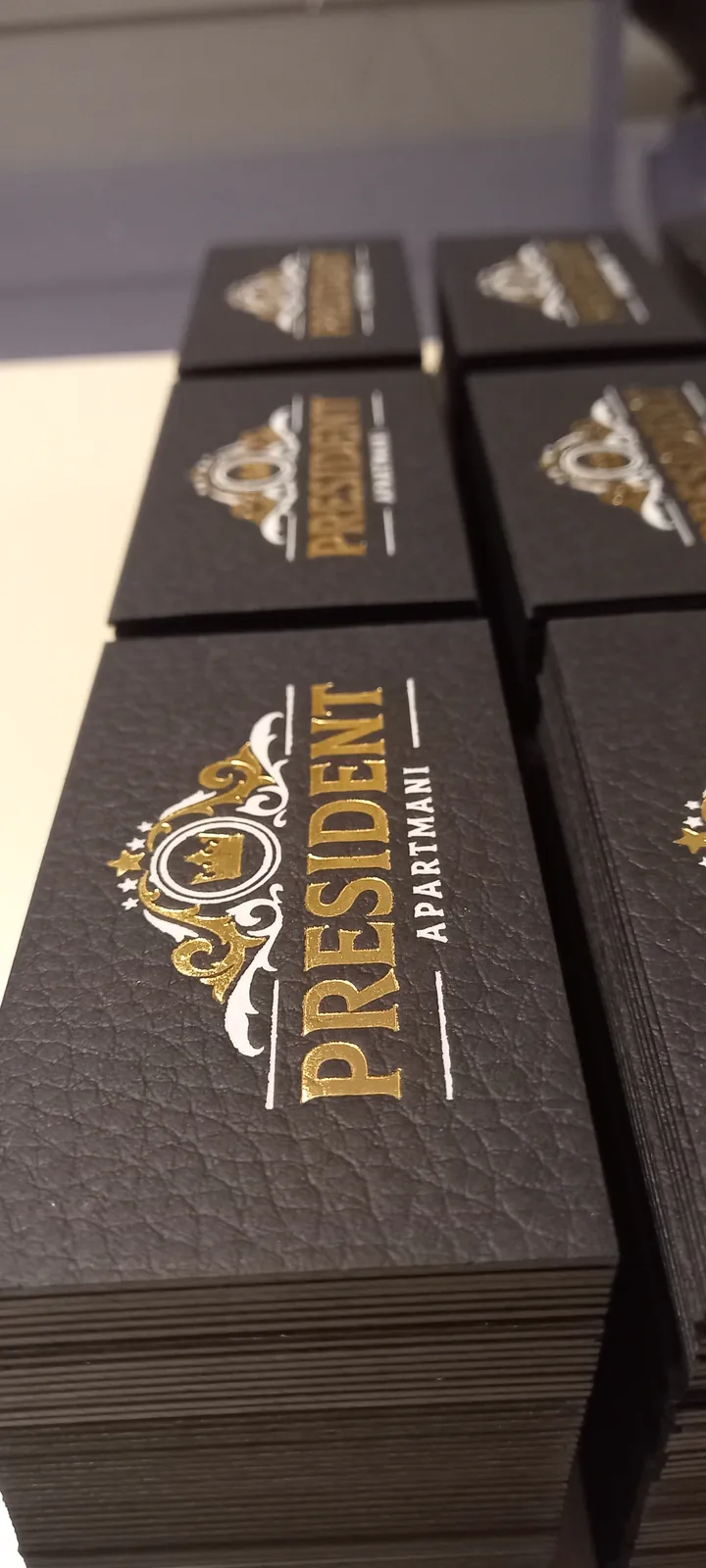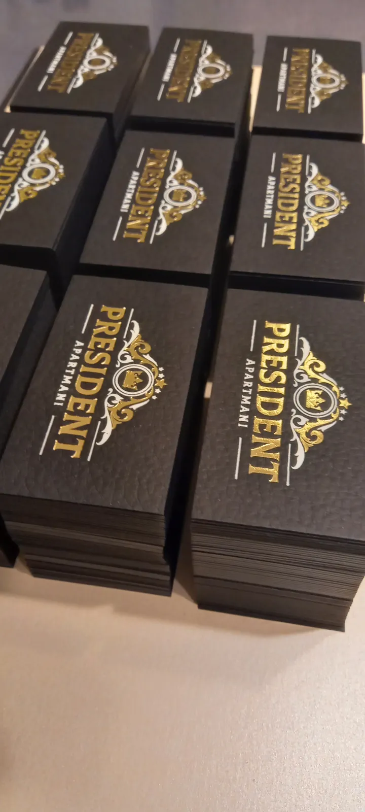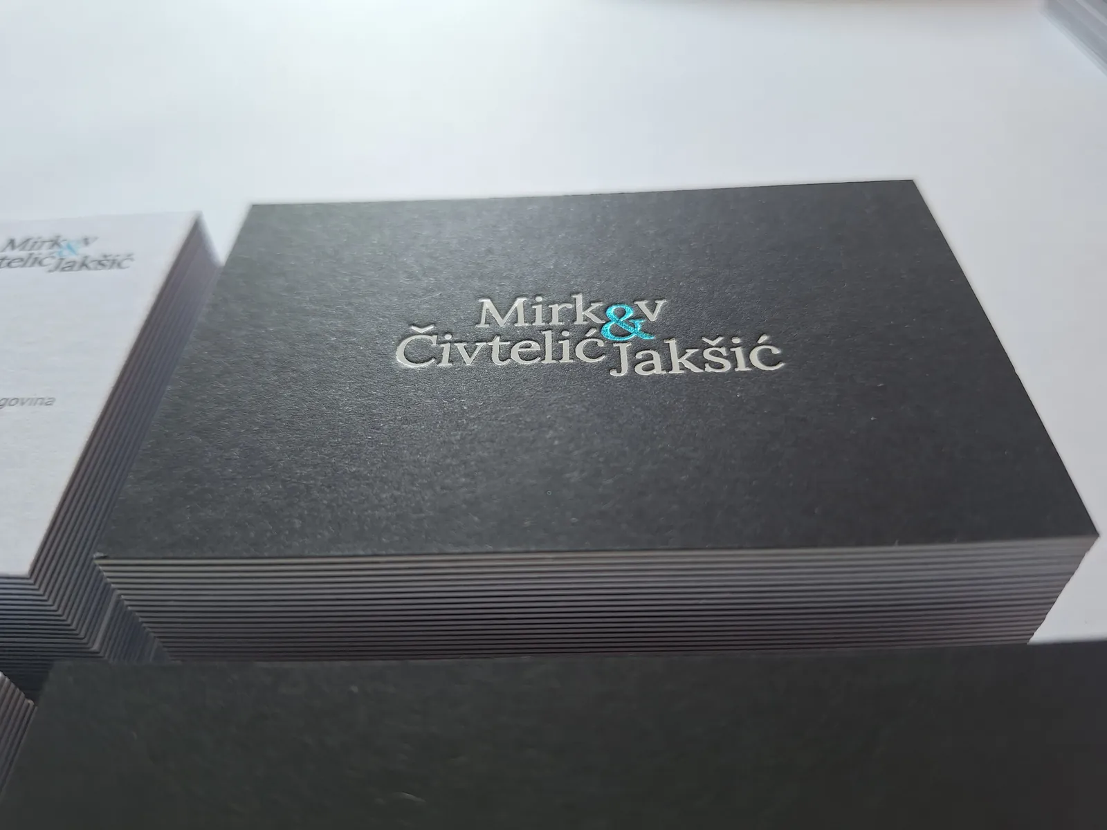 Kada neko zaista želi otmene, luksuzne i neobične vizit karte, neka se obrati nama. Za ovakve vizit karte zaista je potrebno umeće stečeno godinama rada. Kada neko želi izuzetno čvrstu vizit kartu, mi možemo spojiti 3 sloja papira, tako da vizit karta bude debela 1000 mm u preseku. Radili smo čak i deblje, 3-4 cm u preseku. To se više oseća na dodir nego preko ekrana, naravno. Lepljenje slojeva papira se radi mašinski i stručno.Takođe kada neko želi na vizit kartama reljefnu štampu, utisnuta slova, da se ona ne bi videla sa druge strane, radi se kaširanje. Zatim kada je reč o luksuznim papirima sa strukturom kože ili krokodilske kože, koji su takvi samo sa prednje strane,radi se kaširanje kako bi vizit karta bila obostrano sa istom strukturom. Kada je reč o ovim kaširanim vizit kartama, radimo i foliotisak i digitalnu štampu.