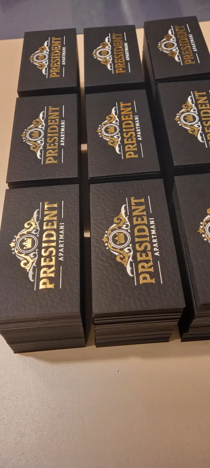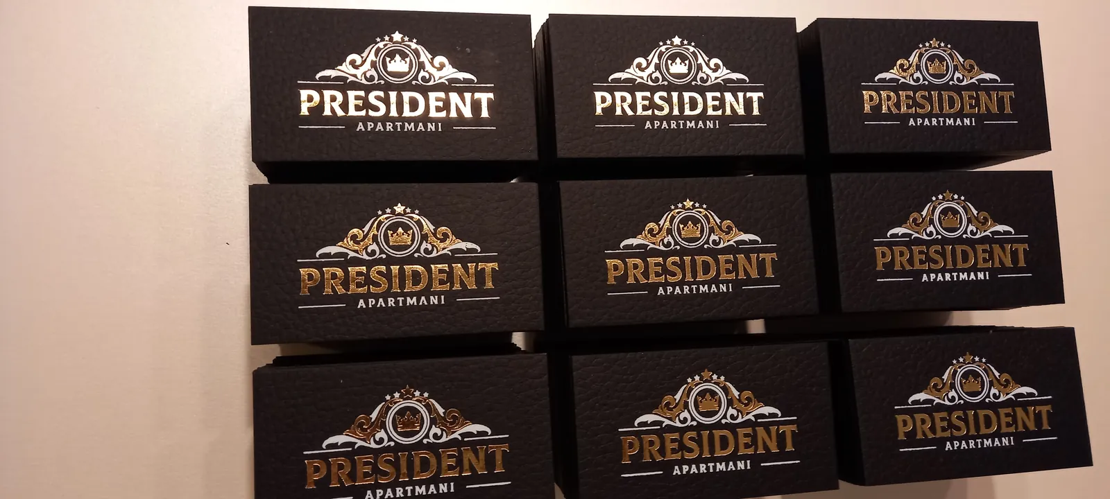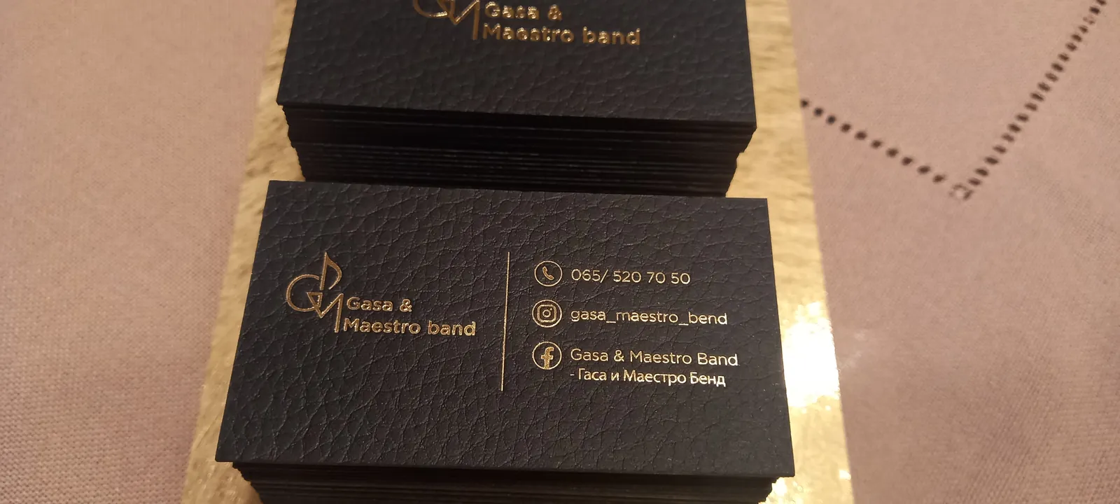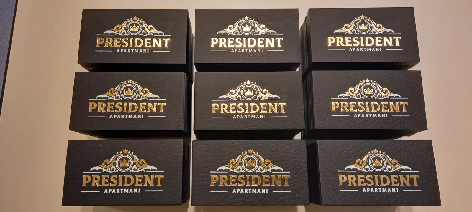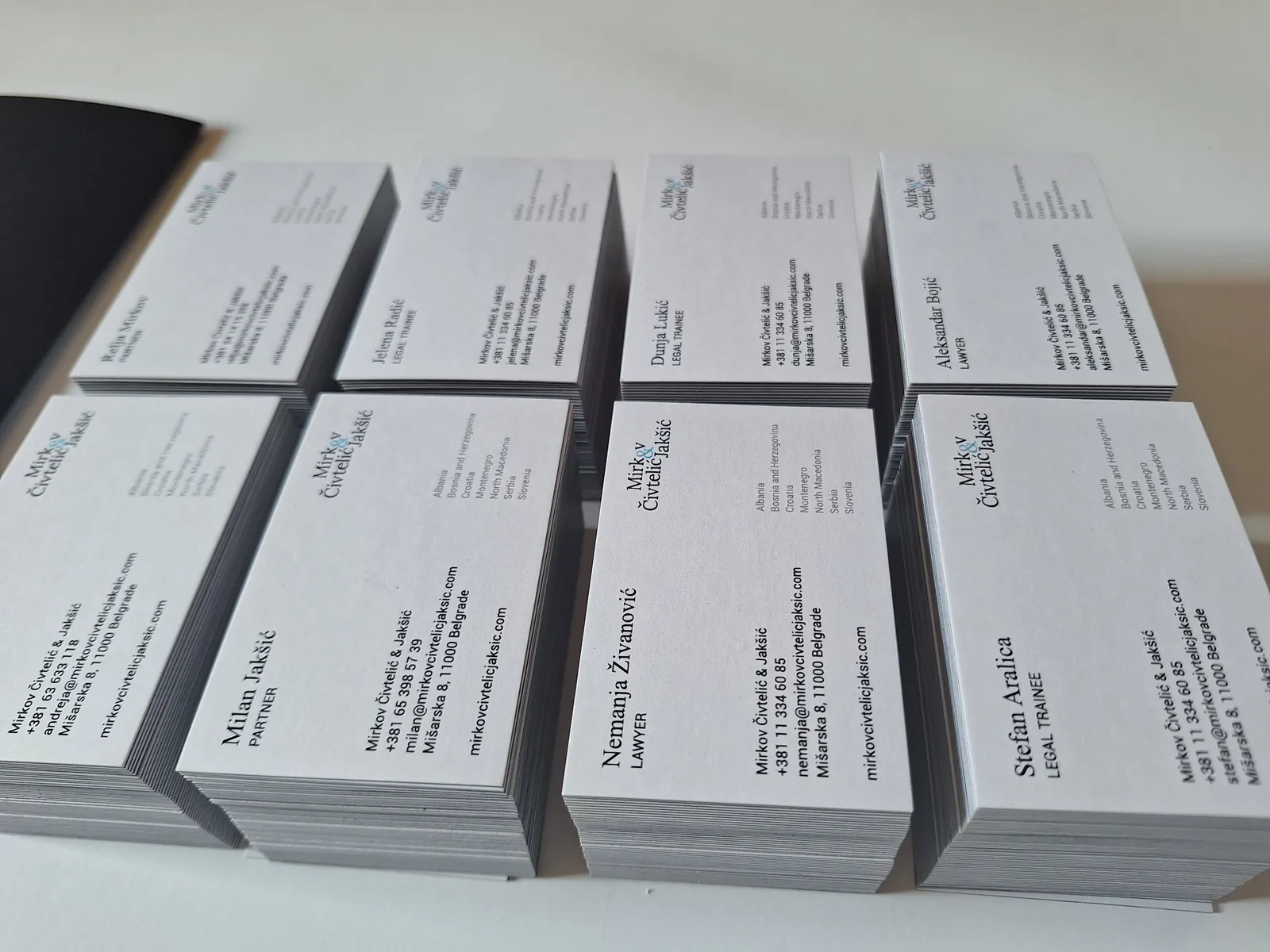 Kada neko zaista želi otmene, luksuzne i neobične vizit karte, neka se obrati nama. Za ovakve vizit karte zaista je potrebno umeće stečeno godinama rada. Kada neko želi izuzetno čvrstu vizit kartu, mi možemo spojiti 3 sloja papira, tako da vizit karta bude debela 1000 mm u preseku. Radili smo čak i deblje, 3-4 cm u preseku. To se više oseća na dodir nego preko ekrana, naravno. Lepljenje slojeva papira se radi mašinski i stručno.Takođe kada neko želi na vizit kartama reljefnu štampu, utisnuta slova, da se ona ne bi videla sa druge strane, radi se kaširanje. Zatim kada je reč o luksuznim papirima sa strukturom kože ili krokodilske kože, koji su takvi samo sa prednje strane,radi se kaširanje kako bi vizit karta bila obostrano sa istom strukturom. Kada je reč o ovim kaširanim vizit kartama, radimo i foliotisak i digitalnu štampu.